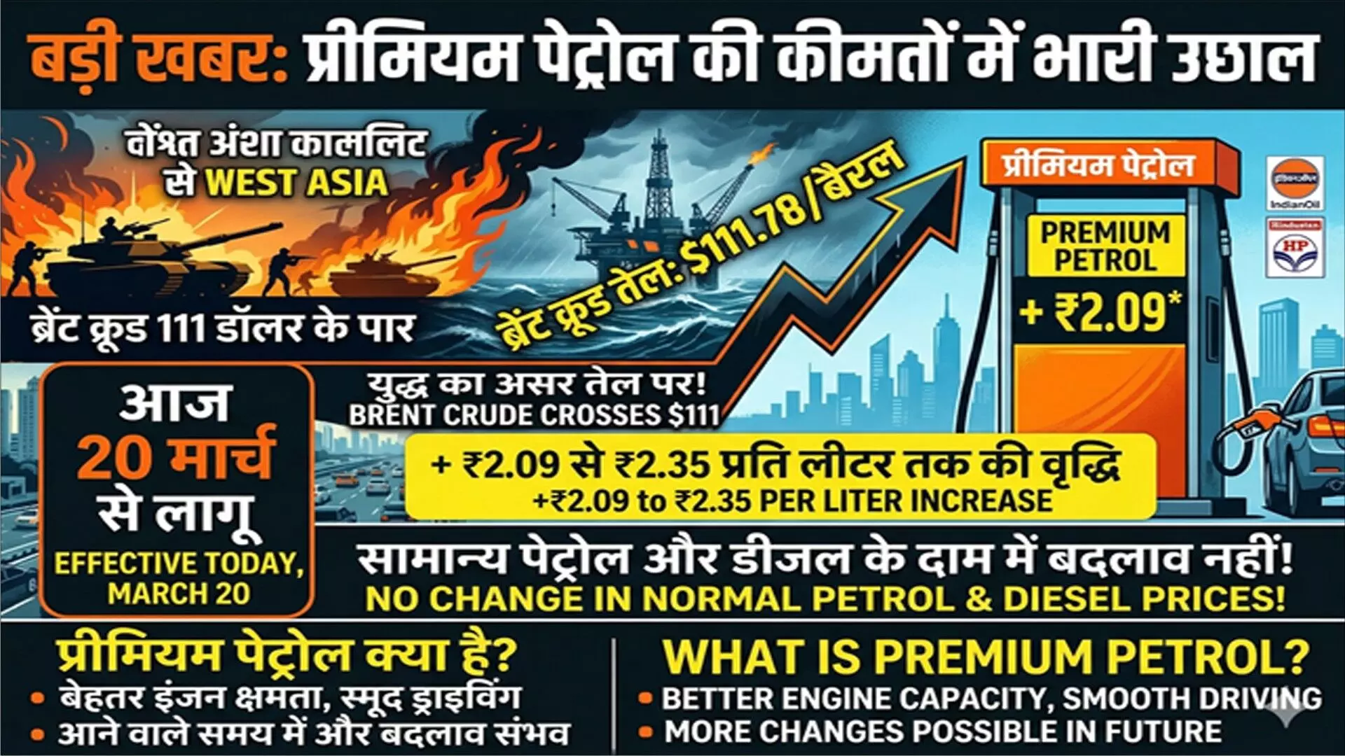 यह बढ़ोतरी ऐसे समय में हुई है, जब वैश्विक कच्चे तेल बाजार में भारी उतार-चढ़ाव देखने को मिल रहा है. 19 मार्च को तेल की कीमतों में 4 प्रतिशत से अधिक की तेजी दर्ज की गई थी. ब्रेंट क्रूड का भाव करीब 111.78 डॉलर प्रति बैरल तक पहुंच गया.