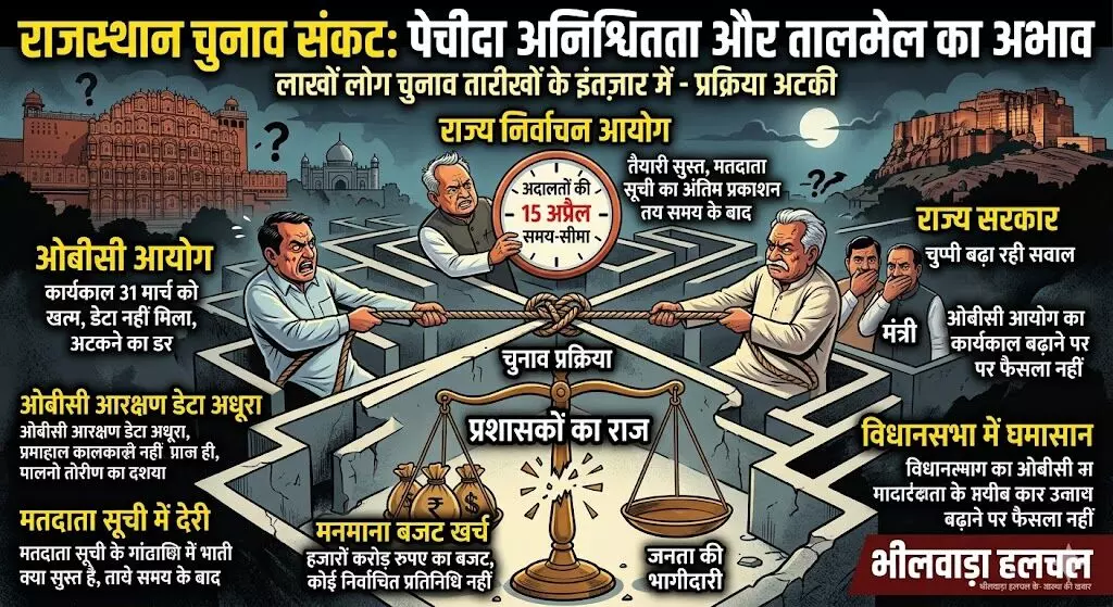 जयपुर/भीलवाड़ा। राजस्थान में स्थानीय निकाय और पंचायत चुनावों को लेकर अनिश्चितता का कुहासा और गहरा गया है। लाखों मतदाता और भावी प्रत्याशी चुनाव की तारीखों के ऐलान की राह तक रहे हैं, लेकिन राज्य सरकार, राज्य निर्वाचन आयोग और ओबीसी आयोग के बीच समन्वय की कमी ने पूरी लोकतांत्रिक प्रक्रिया को अधर में लटका दिया है। आलम यह है कि निर्वाचित प्रतिनिधियों की अनुपस्थिति में नियुक्त प्रशासक अब निकायों और पंचायतों के हजारों करोड़ रुपए के बजट को मनमाने ढंग से खर्च कर रहे हैं।