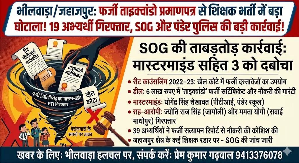 जयपुर/भीलवाड़ा | राजस्थान में सरकारी भर्तियों में फर्जीवाड़े के खिलाफ जारी अभियान के तहत एसओजी (SOG) ने अब तक का सबसे बड़ा प्रहार किया है। तृतीय श्रेणी शिक्षक भर्ती (Level-1 और Level-2) में ताइक्वांडो खेल के फर्जी प्रमाण पत्रों के आधार पर नौकरी हथियाने की साजिश का पर्दाफाश करते हुए एसओजी ने 19 अभ्यर्थियों सहित कुल 20 आरोपियों को गिरफ्तार किया है।