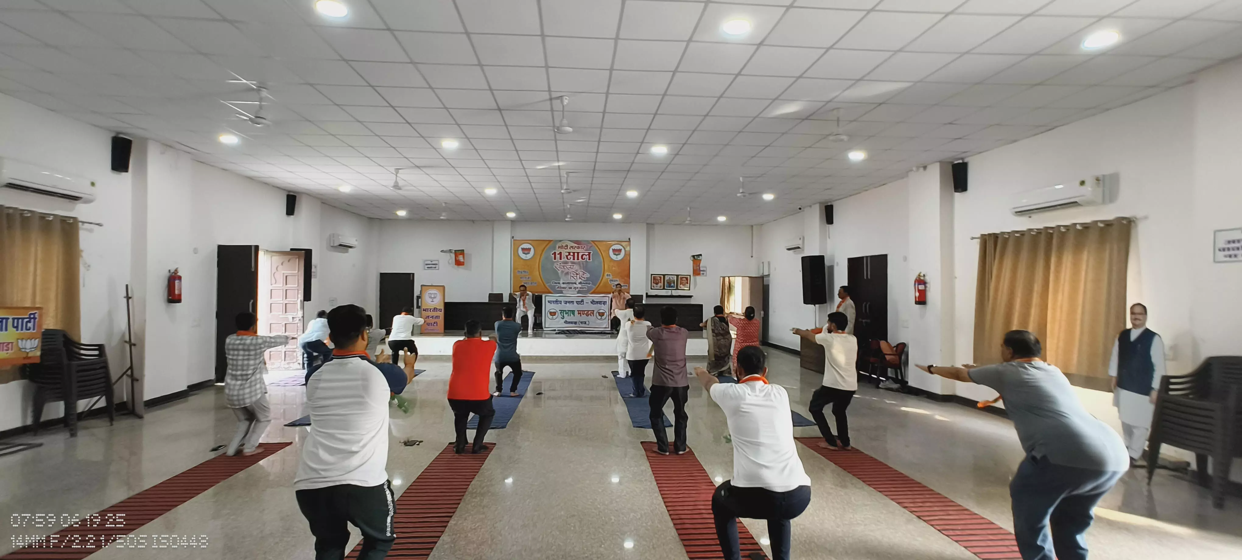 कार्यक्रम सयोजक पुनीत प्रताप सिंह तंवर ने जानकारी देते हुए बताया कि मंडल अध्यक्ष मनीष पालीवाल व कार्यक्रम जिला सहसंयोजक देवेन्द दानी के ने नेतृत्व में प्रातः 7:30 पर जिला कार्यालय पर शिविर का आयोजन किया गया जिस में योग गुरु डॉ श्रंग कुमार सुखवाल में योग से होने वाले फायदे व दैनिक जीवन मे होने वाली परिवर्तन के बारे में जानकारी देते हुए योग अभ्यास कराया इस मे शीतलीकरण आसान , प्राणायाम , सूर्य नमस्कार आदि योग का प्रशिक्षण दिया गया ।