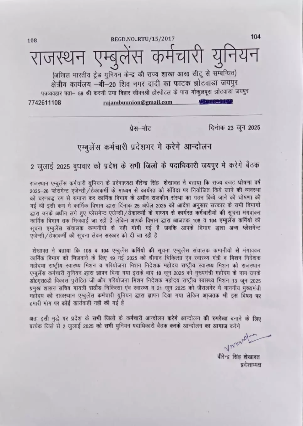राजस्थान एम्बुलेंस कर्मचारी युनियन के प्रदेशाध्यक्ष वीरेन्द्र सिंह शेखावत ने बताया कि राज्य बजट घोषणा वर्ष 2025-26 प्लेसमेन्ट एजेन्सी/ठेकाकर्मी के माध्यम से कार्यरत को संविदा पर नियोजित किये जाने की व्यवस्था को चरणबद्ध रुप से समाप्त कर कार्मिक विभाग के अधीन राजकीय संस्था का गठन किये जाने की घोषणा की गई थी इसी कम में कार्मिक विभाग द्वारा दिनाक 25 अप्रैल 2025 को आदेश अनुसार सरकार के सभी विभागो द्वारा उनके अधीन लगे हुए प्लेसमेन्ट एजेन्सी/ठेकाकर्मी के माध्यम से कार्यरत कर्मचारीयो की सूचना मंगवाकर कार्मिक विभाग तक मिजवाई जा रही है लेकिन आपके विभाग द्वारा आजतक 108 व 104 एम्बुलेंस कर्मियो की सूचना एम्बुलेंस संचालक कम्पनीयों से नहीं मांगी गई है जबकि आपके विभाग द्वारा अन्य प्लेसमेन्ट एजेन्सी/ठेकाकर्मी की सूचना लेकर सरकार को दी जा रही है