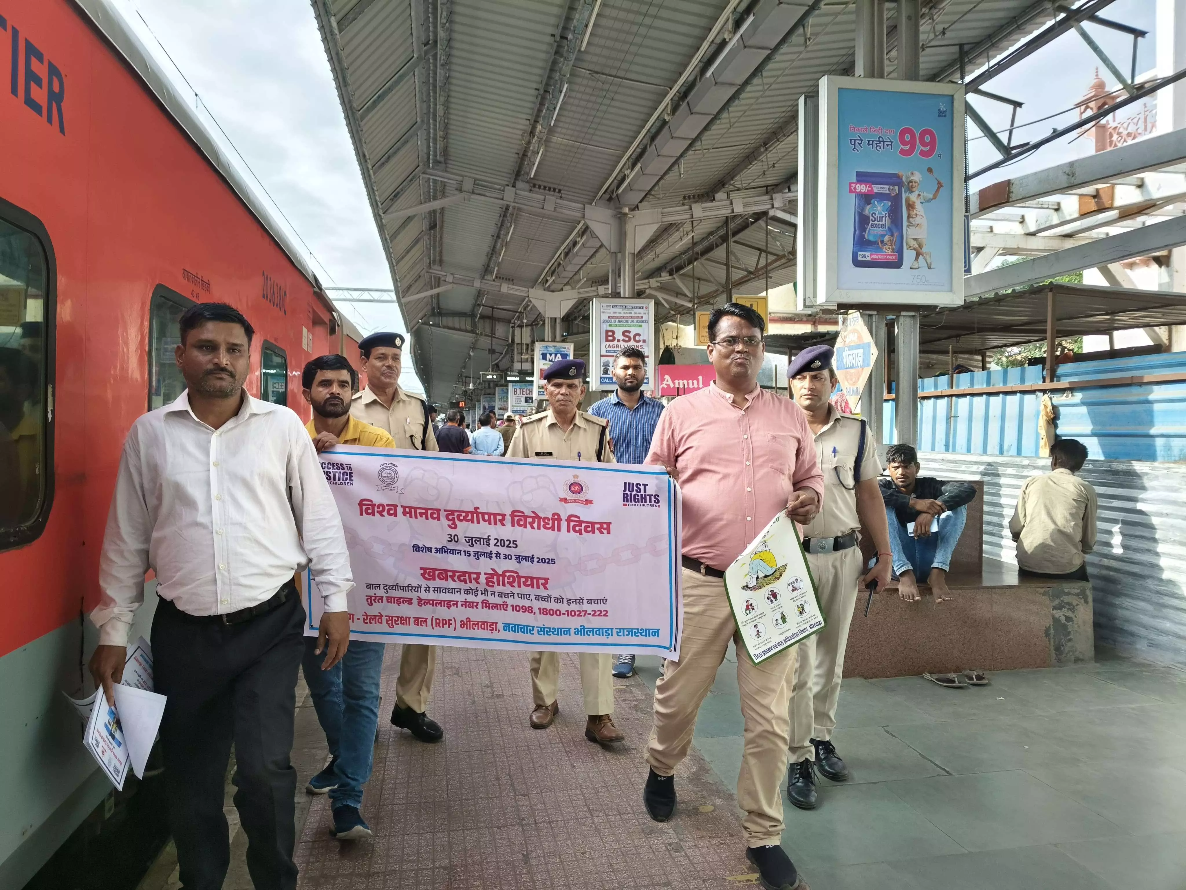 भीलवाड़ा रेलवे स्टेशन पर रेलवे सुरक्षा बल, चाइल्ड हेल्प लाइन 1098 तथा नवाचार संस्थान द्वारा एक्सेस टू जस्टिस फॉर चिल्ड्रन के तहत विश्व मानव दुव्यापार के खिलाफ जागरूकता कार्यक्रम का आयोजन किया गया। इस दौरान रेलवे स्टेशन में उप निरीक्षक प्रेम सिंह व टीम एवं नवाचार संस्थान के समन्वयक जितेंद्र सिंह तोमर, भगवत सिंह चारण अल्का ओझा व बाल अधिकारिता विभाग एवं जिला बाल संरक्षण इकाई के सहायक निदेशक धर्मराज प्रतिहार के निर्देशानुसार चाइल्ड हेल्प लाइन 1098 के सुपरवाइजर राधेश्याम गुर्जर व आनंद कुमार सुनारिया ने जागरूकता अभियान का संचालन किया। उप निरीक्षक प्रेम सिंह ने रेलवे स्टेशन पर मौजूद सभी नागरिकों को जानकारी दिया कि अगर स्टेशन पर किसी प्रकार का बाल तस्करी का मामला आता है, तो तुरंत हेल्पलाइन 1098 पर संपर्क करें। जिससे बाल तस्करी को रोका जा सके । साथ ही रेलवे पुलिस फोर्स के टोल फ्री नंबर की जानकारी देते हुए बताया गया कि किसी लड़का वा लड़की का तस्करी होता है, तो हमे सतर्क रहना है तथा तुरंत सरकार के टोल फ्री नंबर 1098 में कॉल करके सूचना देना है इसके बाद बच्चो को या बच्चा को रेस्क्यू कर उसे बचाया जा सके।