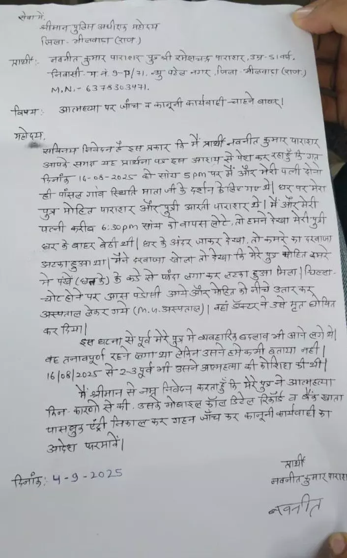 न्यू पटेलनगर निवासी नवनीतकुमार पाराशर ने गुरुवार को जिला पुलिस अधीक्षक को प्रार्थना- पत्र दिया। पाराशर ने प्रार्थना-पत्र में बताया कि 16 अगस्त को वह, पत्नी के साथ माताजी के दर्शन करने पांसल गांव गये थे। घर पर बेटा मोहित पाराशर व बेटी आरती पाराशर थे। शाम साढ़े छह बजे जब वे मंदिर से लौटे तो पुत्री घर के बाहर बैठी थी। अंदर जाकर देखा तो कमरे का दरवाजा अटका हुआ था। दरवाजा खोला तो पुत्र मोहित कमरे में पंखे के कड़े से लटका हुआ था। आस-पास के लोगों की मदद से मोहित को फंदे से उतार कर जिला अस्पताल ले गये, जहां डॉक्टर्स ने उसे मृत घोषित कर दिया।