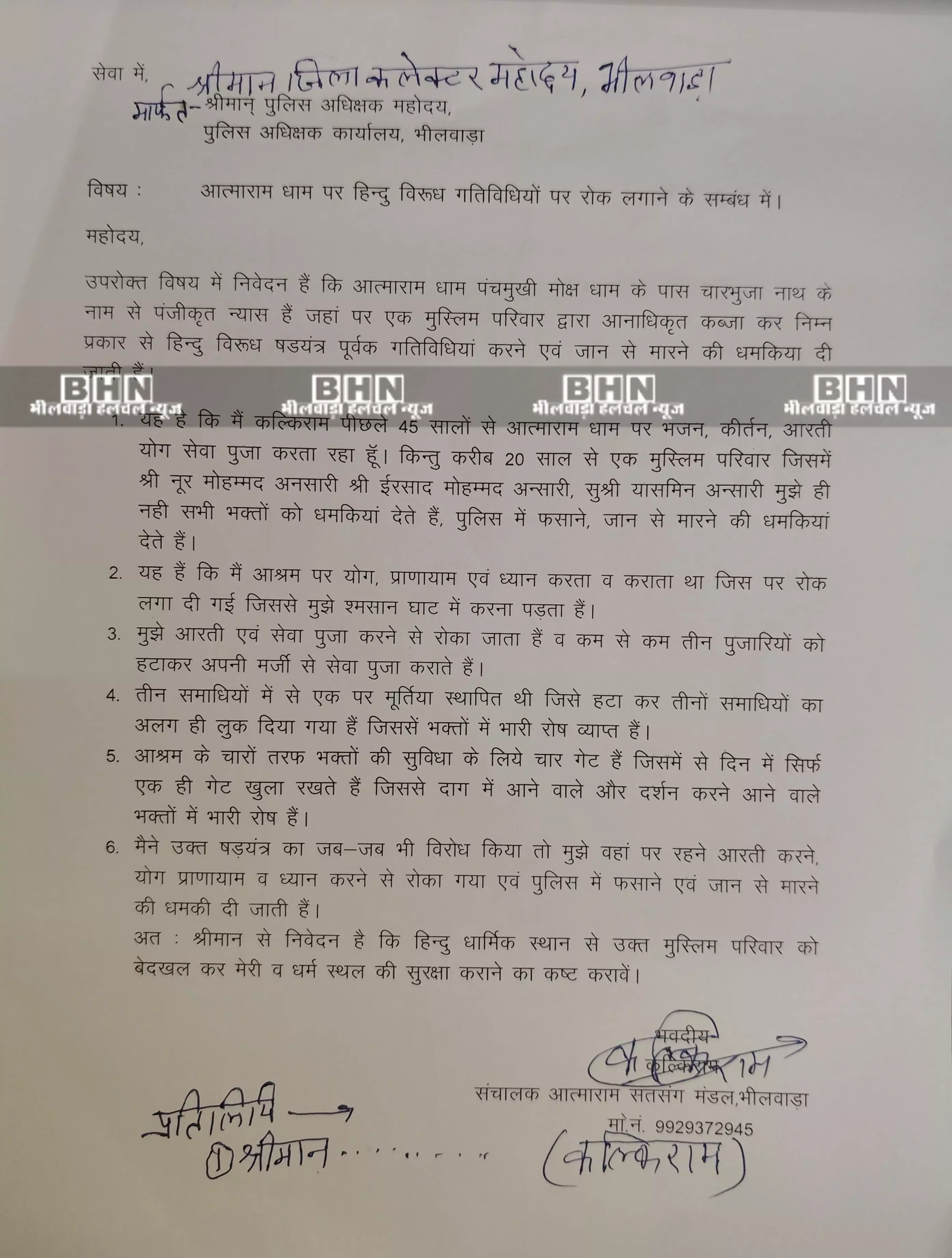 भीलवाड़ा बीएचएन। आत्मारामध धाम पर हिंदू विरोधी गतिविधियों पर रोक और सुरक्षा की गुहार करते हुये आत्माराम सतसंग मंडल संचालक कल्किराम ने जिला कलेक्टर को ज्ञापन दिया है।
