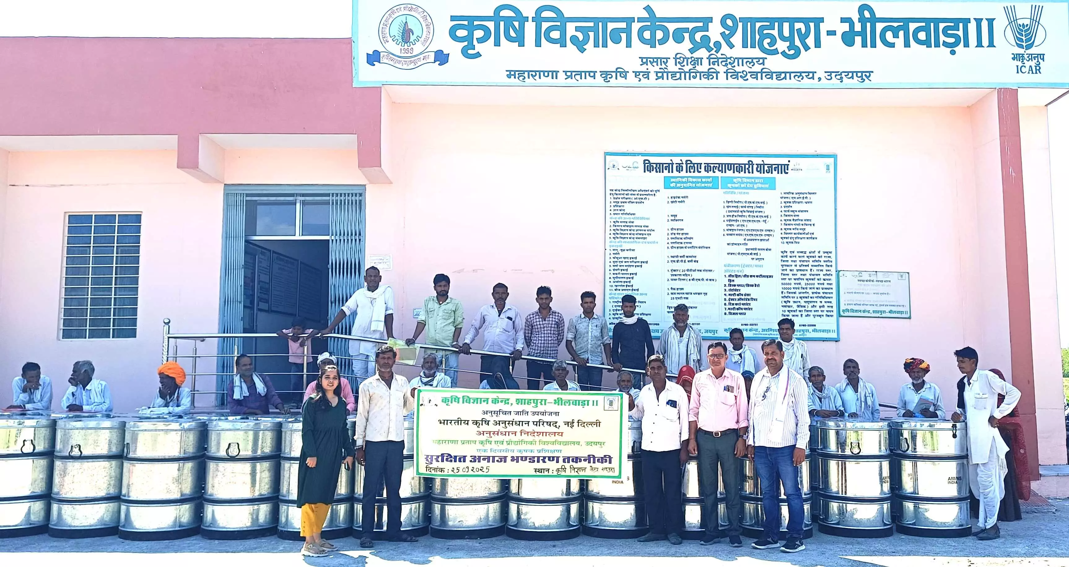 भीलवाड़ा। कृषि विज्ञान केन्द्र शाहपुुरा पर अनुसंधान निदेशालय, महाराणा प्रताप कृषि एवं प्रौद्योगिकी विश्वविद्यालय, उदयपुर द्वारा प्रायोजित अनुसूचित जाति उपयोजनान्तर्गत एक दिवसीय कृषक प्रशिक्षण एवं आदान वितरण कार्यक्रम का आयोजन किया गया। केन्द्र के वरिष्ठ वैज्ञानिक एवं अध्यक्ष डॉ. सी. एम. यादव ने केन्द्र की गतिविधियों से अवगत करवाते हुए अनाज का सुरक्षित भण्ड़ारण कर आमदनी बढ़ाने पर जोर दिया। डॉ. यादव ने बताया कि भारत की बढ़ती आबादी को देखते हुए अनाज के सुरक्षित भण्ड़ारण के साथ-साथ जनसंख्या नियन्त्रण भी आवश्यक है।