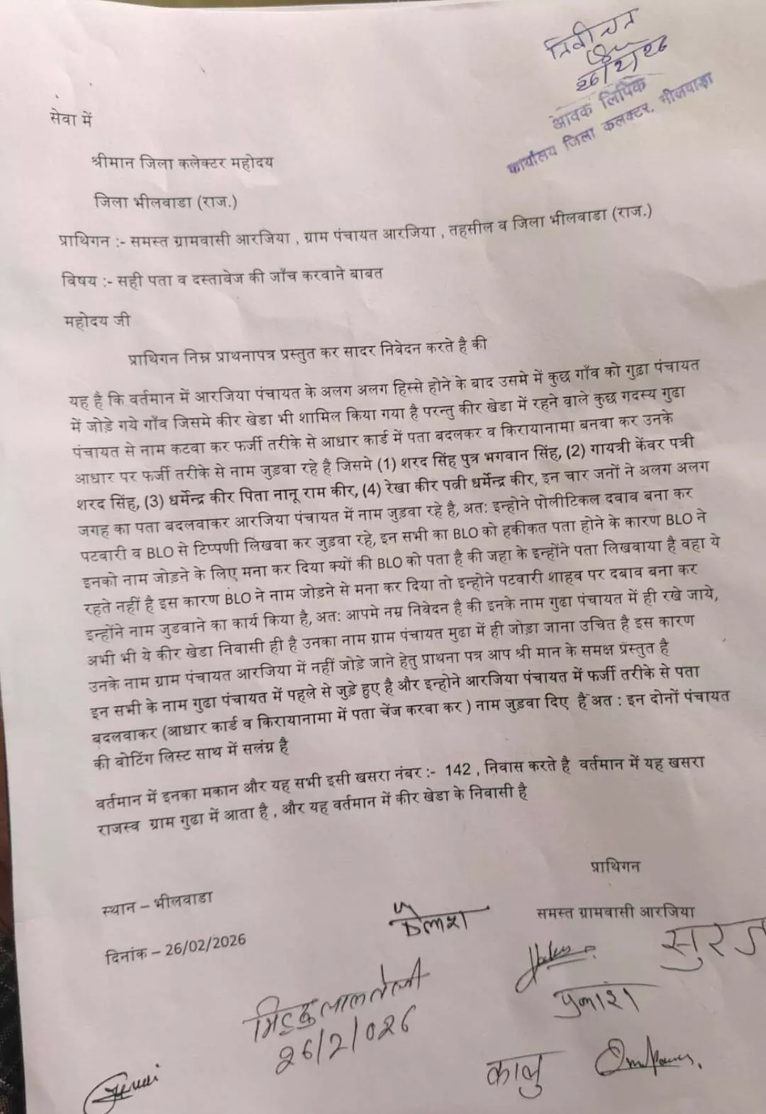 जिला कलेक्टर को सौंपे गए प्रार्थना पत्र में ग्रामीणों ने बताया कि वर्तमान में आरजिया पंचायत के पुनर्गठन के बाद कुछ गांव गुढ़ा पंचायत में शामिल किए गए हैं, जिनमें कीर खेड़ा भी शामिल है। आरोप है कि कीर खेड़ा निवासी शरद सिंह, गायत्री कंवर, धर्मेंद्र कीर और रेखा कीर वर्तमान में गुढ़ा पंचायत के राजस्व ग्राम के खसरा नंबर 142 में निवास कर रहे हैं। इन व्यक्तियों ने कथित तौर पर आधार कार्ड में पता बदलकर और फर्जी किरायानामा तैयार करवाकर आरजिया पंचायत में नाम जुड़वाने की प्रक्रिया शुरू की है।