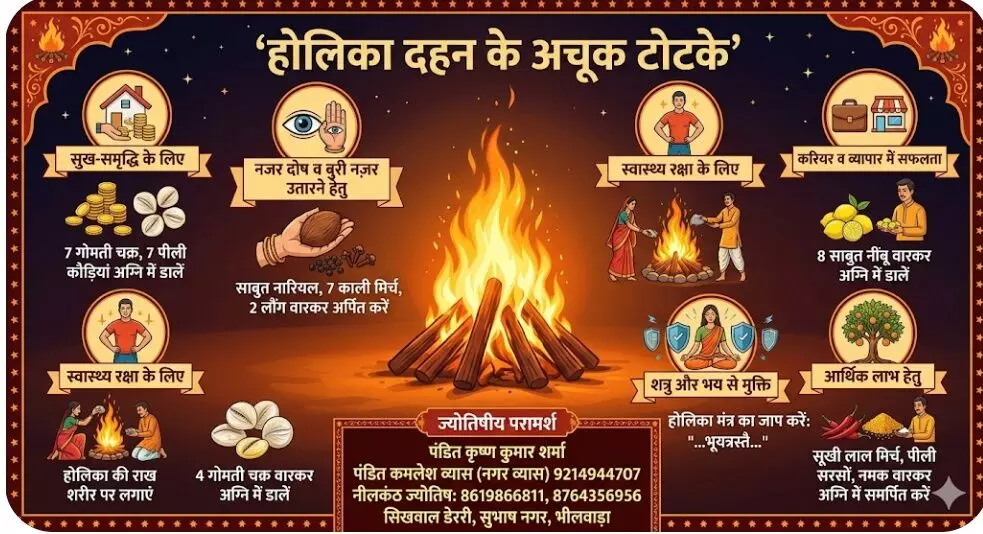भीलवाड़ा। बुराई पर अच्छाई की जीत का प्रतीक 'होलिका दहन' केवल धार्मिक अनुष्ठान ही नहीं, बल्कि नकारात्मक ऊर्जा को समाप्त करने का एक महासंयोग भी है। ज्योतिष शास्त्र के अनुसार, होलिका दहन की अग्नि में किए गए विशेष उपाय और टोटके जीवन की बड़ी से बड़ी बाधाओं को दूर कर सुख, शांति और समृद्धि ला सकते हैं।