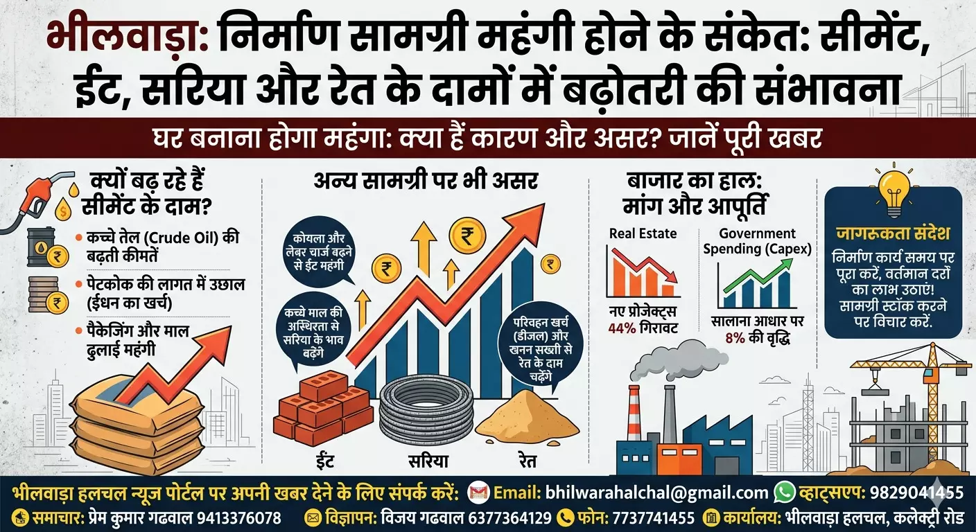 भीलवाड़ा | अगर आप अपना सपनों का घर बनाने की योजना बना रहे हैं या निर्माण कार्य शुरू करने वाले हैं, तो यह खबर आपके लिए बेहद महत्वपूर्ण है। आने वाले दिनों में निर्माण सामग्री की कीमतों में भारी बढ़ोतरी के संकेत मिल रहे हैं। कच्चे तेल की वैश्विक कीमतों में उछाल और लॉजिस्टिक खर्च बढ़ने के कारण न केवल सीमेंट, बल्कि ईंट, सरिया और रेत के दामों में भी तेजी आने की पूरी संभावना है।