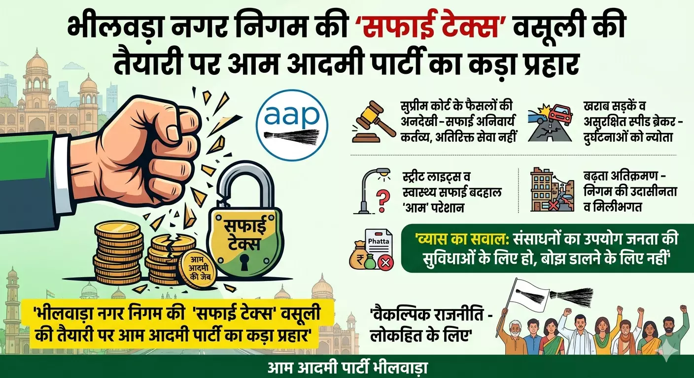 भीलवाड़ा | नगर निगम द्वारा सफाई व्यवस्था का अतिरिक्त आर्थिक भार आम जनता पर डालने की तैयारी को आम आदमी पार्टी ने अन्यायपूर्ण और तानाशाही करार दिया है। पार्टी के वरिष्ठ नेता और स्थाई लोक अदालत के पूर्व सदस्य एडवोकेट प्रहलाद राय व्यास ने इस कदम को आम आदमी की जेब पर डाका बताया है।