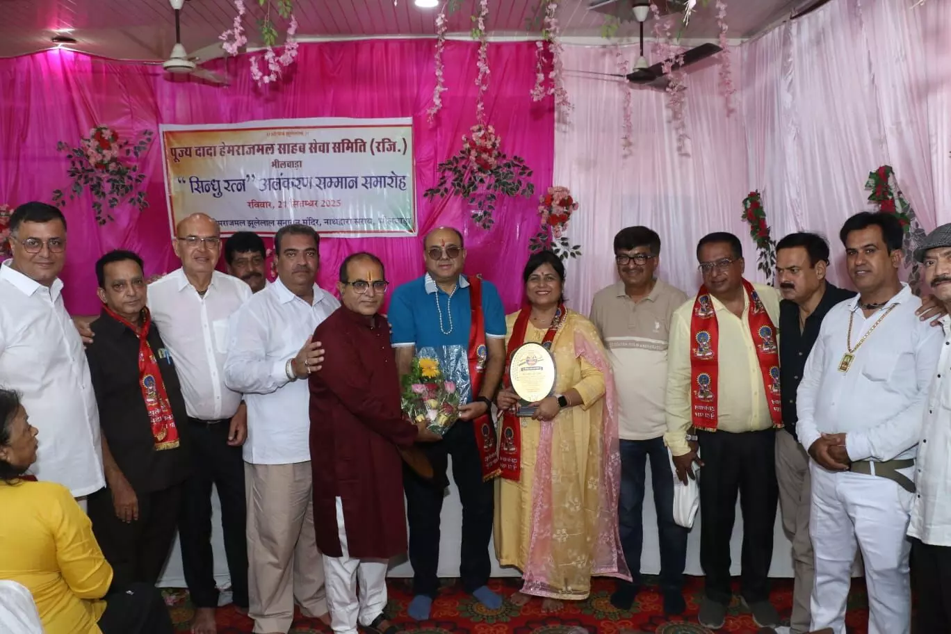 भीलवाड़ा (पिकू खोतानी) सिंधी समाज के अग्रणी सेवा प्रकल्प पूज्य दादा हेमराजमल साहब सेवा समिति के तत्वावधान में स्थानीय नाथद्वारा सराय स्थित पूज्य दादा हेमराज मल भगत झूलेलाल सनातन मन्दिर में दादा हेमराज मल साहब सेवा समिति के तत्वा वधान में आयोजित "सिंधु रत्न अलंकरण समारोह" में सिंधी समाज के डा. वीरभान चंचलानी, गिरीश-आशा दत्ता, मनोज गंगवानी, कमल-रिचा रिजवानी, अमित थावानी, वंदना थावानी, जितेंद्र थावानी, प्रियंका-धनीश खूबचंदानी, प्रकाश-अंजू थावानी, विशाल जेठानी, मोहनदास थावानी, रोहित सचदेव, लकी नारवानी, अमित थावानी, समीर ठाकुर, अशोक खटवानी, रचना सखरानी, महिमा माखीजा, भूपेंद्र-नीलम भोजवानी, कन्हैयालाल जेठानी, लकी नारवानी, वर्षा-दिलीप गजवानी सहित 35 डॉक्टरों सहित स्वास्थ्य कार्यकर्ताओं को अपने चिकित्सकीय कौशल से रोगियों की सेवा और सिंधी समाज में उनके योगदान के लिए श्रीफल व सिंधु चिन्ह भेंट कर सिंधु रत्न प्राइड सम्मान से सम्मानित किया गया.