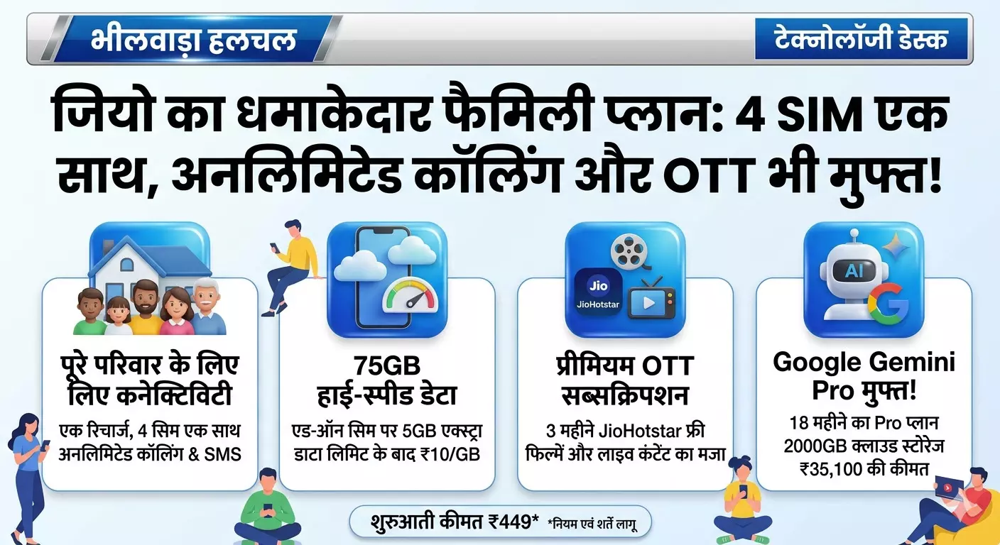 भीलवाड़ा (टेक्नोलॉजी डेस्क)। रिलायंस जियो ने अपने ग्राहकों के लिए एक बेहतरीन पोस्टपेड फैमिली प्लान पेश किया है, जो कम कीमत में पूरे परिवार की कनेक्टिविटी जरूरतों को पूरा करता है। ₹449 की शुरुआती कीमत वाला यह प्लान न केवल डेटा और कॉलिंग की सुविधा देता है, बल्कि इसमें प्रीमियम एंटरटेनमेंट और AI टूल्स का लाभ भी शामिल है।