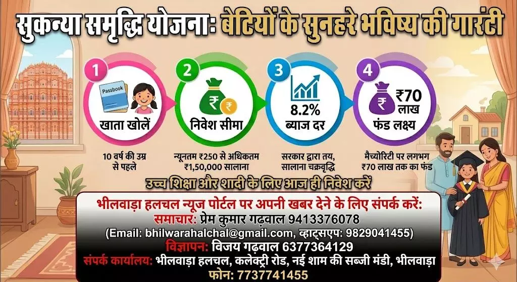 भीलवाड़ा। बेटियों के भविष्य को आर्थिक रूप से सुरक्षित और सशक्त बनाने के लिए केंद्र सरकार की 'सुकन्या समृद्धि योजना' (SSY) माता-पिता के लिए एक बेहतरीन विकल्प साबित हो रही है। उच्च शिक्षा और शादी के खर्चों की चिंता दूर करने वाली इस योजना में सही प्लानिंग के साथ निवेश किया जाए, तो बेटी के बालिग होने तक लगभग 70 लाख रुपये का बड़ा फंड तैयार किया जा सकता है।शानदार ब्याज दर और टैक्स में छूटसुकन्या समृद्धि योजना वर्तमान में 8.2% सालाना चक्रवृद्धि ब्याज दे रही है, जो बैंक एफडी (FD) और अन्य बचत योजनाओं के मुकाबले काफी अधिक है। सबसे खास बात यह है कि इसमें किया गया निवेश इनकम टैक्स एक्ट की धारा 80C के तहत टैक्स छूट के दायरे में आता है और मैच्योरिटी पर मिलने वाली पूरी राशि भी टैक्स फ्री होती है।योजना की मुख्य शर्तें और निवेश सीमाखाता खोलना: बेटी के 10 वर्ष की आयु पूरी होने से पहले पोस्ट ऑफिस या किसी भी अधिकृत बैंक में खाता खुलवाया जा सकता है। एक परिवार में अधिकतम दो बेटियों के लिए यह सुविधा उपलब्ध है।निवेश राशि: एक वित्तीय वर्ष में न्यूनतम ₹250 और अधिकतम ₹1,50,000 जमा किए जा सकते हैं।अवधि: खाता खुलने के बाद 15 साल तक निवेश करना अनिवार्य है। इसके बाद 21 साल पूरे होने पर खाता मैच्योर हो जाता है।ऐसे तैयार होगा ₹70 लाख का बड़ा फंड (कैलकुलेशन)यदि आप बेटी के जन्म के पहले वर्ष में ही खाता खुलवाते हैं और योजना का अधिकतम लाभ लेते हैं, तो गणित कुछ इस प्रकार होगा:विवरणराशि / जानकारीसालाना निवेश₹1,50,000कुल निवेश अवधि15 वर्षकुल निवेश राशि (मूलधन)₹22,50,000कुल ब्याज आय (8.2% की दर से)₹46,77,578मैच्योरिटी पर कुल फंड₹69,27,578जरूरत पड़ने पर निकासी के नियमबेटी के 18 साल की उम्र पूरी करने या 10वीं कक्षा पास करने के बाद उच्च शिक्षा के लिए खाते से 50% तक राशि निकाली जा सकती है। यदि बेटी की शादी 21 साल से पहले होती है, तो उस समय भी खाता बंद कर पूरी राशि प्राप्त की जा सकती है।यदि किसी कारणवश निवेश रुक जाता है, तो मात्र ₹50 का जुर्माना देकर खाते को पुनः सक्रिय (Active) कराया जा सकता है। विशेषज्ञों के अनुसार, सुरक्षित निवेश और निश्चित रिटर्न के मामले में यह देश की सर्वश्रेष्ठ सरकारी योजनाओं में से एक है।भीलवाड़ा हलचल न्यूज पोर्टल पर अपनी खबर देने के लिए संपर्क करें:समाचार: प्रेम कुमार गढवाल 9413376078(Email: [email protected], व्हाट्सएप: 9829041455)विज्ञापन: विजय गढवाल 6377364129संपर्क कार्यालय: भीलवाड़ा हलचल, कलेक्ट्री रोड, नई शाम की सब्जी मंडी, भीलवाड़ाफोन: 7737741455