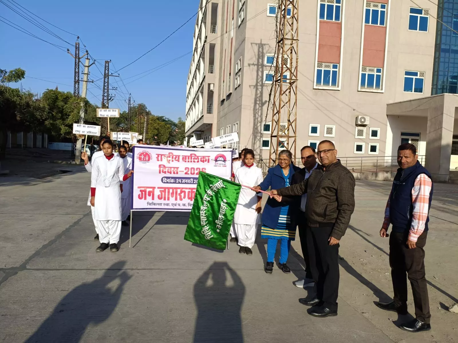 भीलवाड़ा। राष्ट्रीय बालिका दिवस के अवसर पर महात्मा गांधी राजकीय जिला चिकित्सालय परिसर से बालिकाओं के अधिकारों, शिक्षा, स्वास्थ्य एवं सशक्तिकरण को लेकर जागरूकता फैलाने के उद्देश्य से एक भव्य जनजागरूकता रैली का आयोजन किया गया। मुख्य चिकित्सा एवं स्वास्थ्य अधिकारी डॉ. संजीव शर्मा व आरवीआरएस मेडिकल कॉलेज प्राचार्या डॉ0 वर्षा सिंह ने हरी झंडी दिखाकर रैली को रवाना किया।