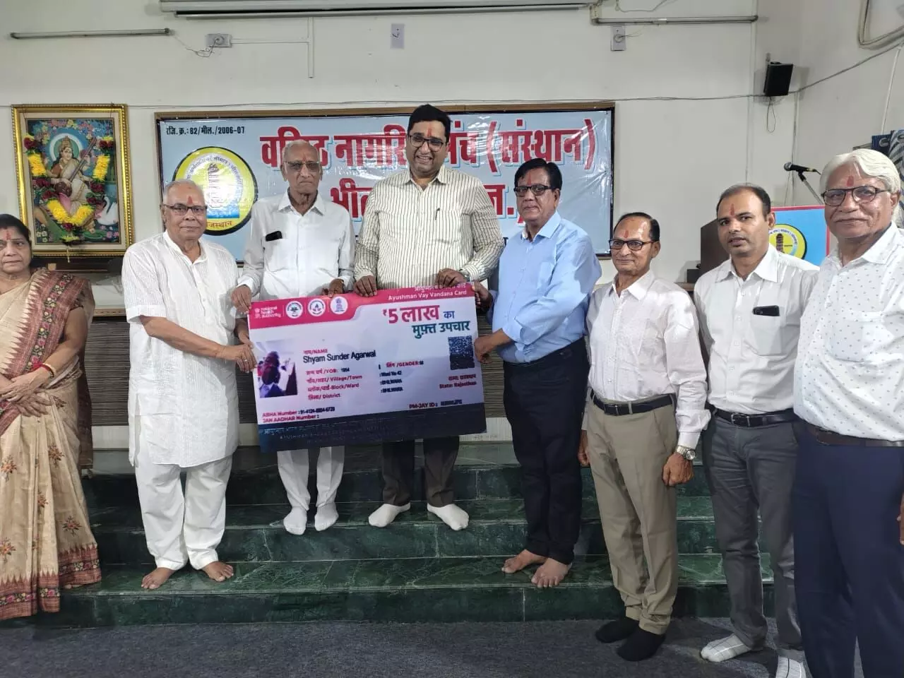 भीलवाड़ा, । वरिष्ठ नागरिक मंच (संस्थान) भीलवाड़ा व चिकित्सा विभाग के तत्वावधान में आयुष्मान भारत योजना एवं प्रधानमंत्री वय वंदन योजना के अंतर्गत 70 वर्ष से अधिक आयु के नागरिकों के लिए रजिस्ट्रेशन एवं ई-केवाईसी शिविर का आयोजन वरिष्ठ नागरिक भवन, गायत्री मन्दिर के पास, लव गार्डन रोड पर किया गया। शिविर का शुभारंभ मुख्य चिकित्सा एवं स्वास्थ्य अधिकारी डॉ. सीपी गोस्वामी द्वारा दीप प्रज्वलन कर किया गया।