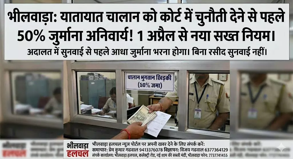 भीलवाड़ा हलचल । यातायात नियमों का उल्लंघन कर चालान कटने के बाद कोर्ट की शरण लेने वाले वाहन चालकों पर सरकार ने सख्त चाबुक चलाया है। अब कोई भी वाहन चालक सीधे न्यायालय का दरवाजा नहीं खटखटा सकेगा। सरकार के नए फरमान के मुताबिक, चालान के खिलाफ कोर्ट में चुनौती देने से पहले कुल जुर्माने की 50 प्रतिशत राशि जमा करानी अनिवार्य कर दी गई है। बिना यह आधी राशि जमा किए कोर्ट में सुनवाई का अवसर ही नहीं मिलेगा। यह कड़ा नियम नए वित्तीय वर्ष की शुरुआत यानी 1 अप्रैल से भीलवाड़ा सहित पूरे देश में सख्ती से लागू होने जा रहा है।