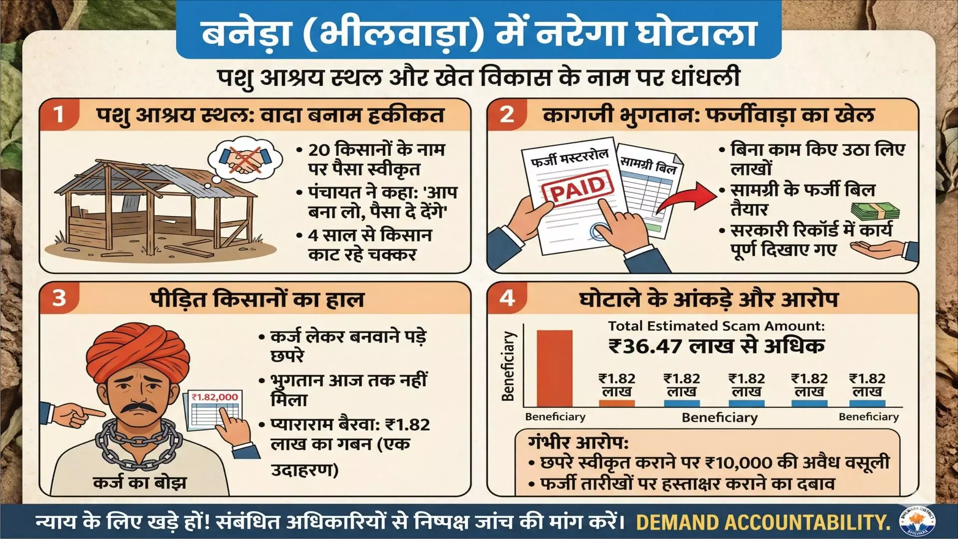 भीलवाड़ा । जिले की बनेड़ा पंचायत समिति की कासोरिया ग्राम पंचायत में महात्मा गांधी नरेगा योजना के तहत एक बड़ा घोटाला सामने आया है। यहाँ खेत विकास और पशु आश्रय स्थल (छपरे) निर्माण के नाम पर करीब 36.47 लाख रुपये के गबन का आरोप लगा है। विडंबना यह है कि जिन किसानों के नाम पर पैसा स्वीकृत हुआ, उन्हें अपने स्तर पर कर्ज लेकर निर्माण करवाना पड़ा, जबकि सरकारी रिकॉर्ड में भुगतान पहले ही उठाया जा चुका है।