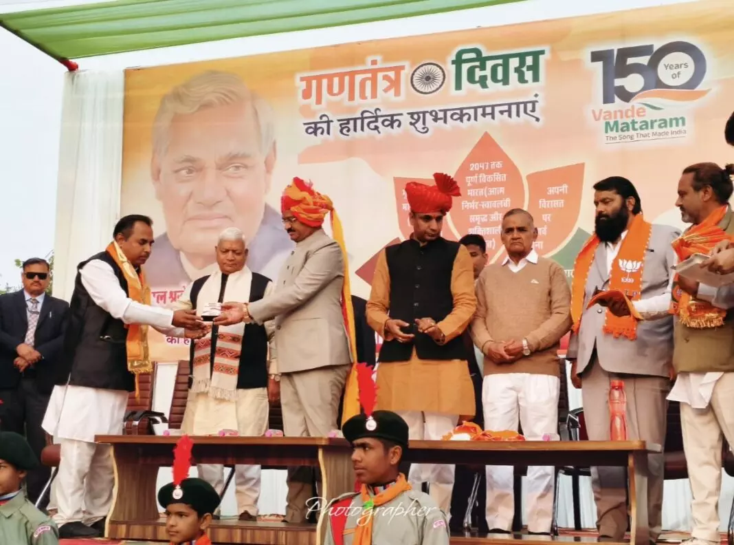 भीलवाड़ा गणतंत्र दिवस पर मुख्यमंत्री राजस्थान सरकार प्रेमचंद बैरवा, भीलवाड़ा लोकसभा सांसद दामोदर अग्रवाल द्वारा अधिवक्ता पीरू सिंह गौड़ को भाजपा कार्यालय पर जिलाध्यक्ष प्रशांत मेवाड़ा, पूर्व सांसद सुभाष बहेड़िया,पूर्व विधायक विट्ठल शंकर अवस्थी, मांडल विधायक उदयलाल भड़ाना की गरिमामयी उपस्थिति मे 80 बार रक्तदान करने पर ऊपरना पहनाकर व मोमेंटो भेंट कर सम्मानित किया गया| साथ ही जिला न्यायालय मे आयोजित गणतंत्र दिवस पर मुख्य अतिथि मोटर दुर्घटना दावा अधिकरण न्यायाधीश नवीन चौधरी व जिला अभिभाषक संस्था अध्यक्ष उम्मेदसिंह राठौड़, उपाध्यक्ष महिपाल सिंह राणावत, महासचिव पंकज दाधीच, रेवेन्यू महसचिव मनोहरलाल बुनकर, कोषाध्यक्ष रवि गोरानी, सह-सचिव आदित्य सिंह चौहान, पुस्तकालय सचिव प्रताप तेली द्वारा महिला उत्पीड़न न्यायाधीश सुषमा शर्मा, मुख्य न्यायिक मजिस्ट्रेट नगेंद्र सिंह, अतिरिक्त मुख्य न्यायिक मजिस्ट्रेट सुभाष चंद्र कोटिया व विशेष नागरवाल तथा अधिवक्ताओ की गरिमामयी उपस्थिति मे ऊपरना व मेवाड़ी पगड़ी पहनाकर सम्मानित किया गया|
