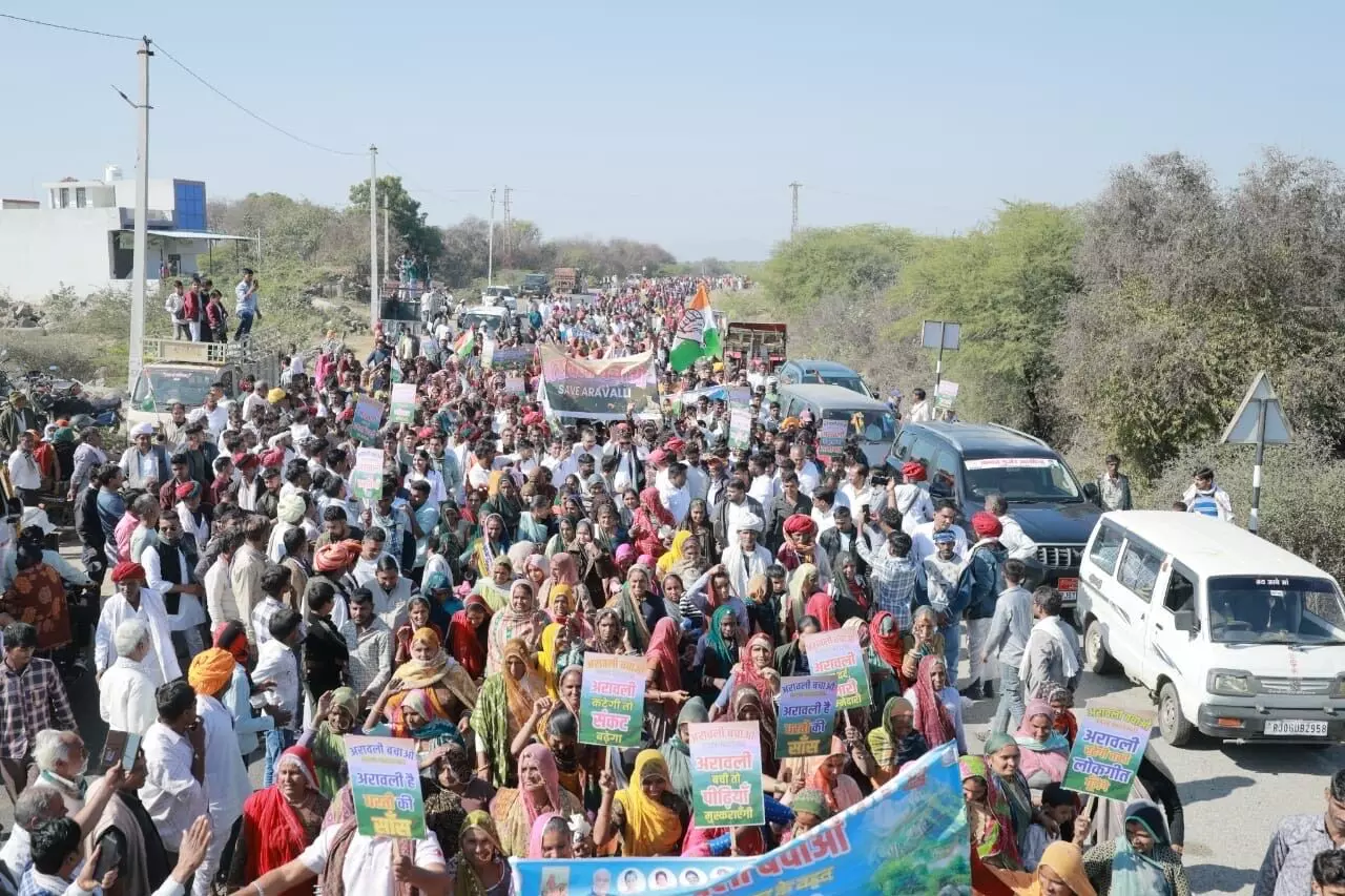 भीलवाड़ा । अखिल भारतीय कांग्रेस कमेटी एव प्रदेश काँग्रेस कमेटी के प्रदेश अध्यक्ष गोविंद सिंह डोटासरा के निर्देशानुसार *अरावली बचाऔ जन- आंदोलन* के तहत जिला काँग्रेस कमेटी भीलवाड़ा (देहात) के जिलाध्यक्ष रामलाल जाट के नेतृत्व में *जन जागरण पद यात्रा* आज प्रात: 10.00 बजे अरावली की तलेटी, पाबू राठोड़ के मंदिर, सुराज चौराहा NH 148 D सें प्रारम्भ होकर बेमाता मंदिर कीडीमाल(करेड़ा) पर समापन हुई । शंकर लाल गाडरी ने बताया कि जनजागरण पद यात्रा के शुभारंभ के अवसर पर अरावली को बचाने वाले सामाजिक कार्यक्रताओ के द्वारा कटपुतली नाटक, गीत, भजन के माध्यम से आमजन को जागरूक किया और किस प्रकार इस प्रकृति पर काले कानून पास हुए किस तरह मनरेगा का नाम संसद में बदला गया । इस अवसर पर जाट ने कहा