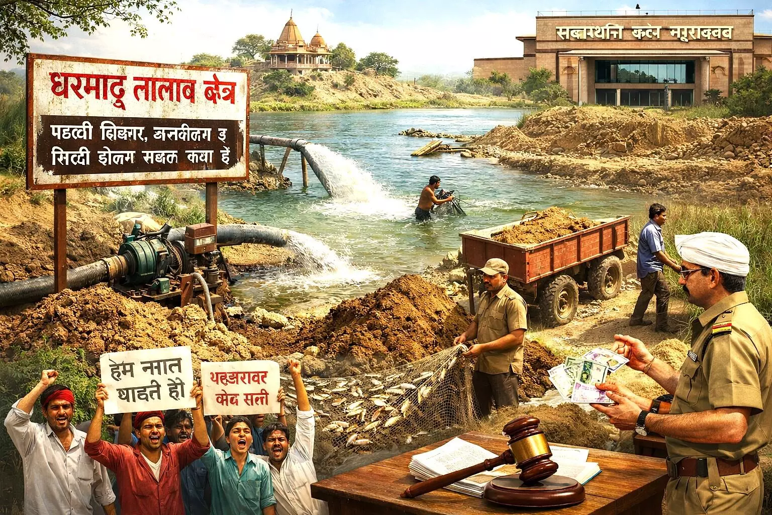 धर्माउ तालाब पर डाका! कोर्ट के आदेश, कलेक्टर के निर्देश,सब बेअसर, पटवारी-गिरदावर-खाप की तिकड़ी ने पानी-मिट्टी लूटी
