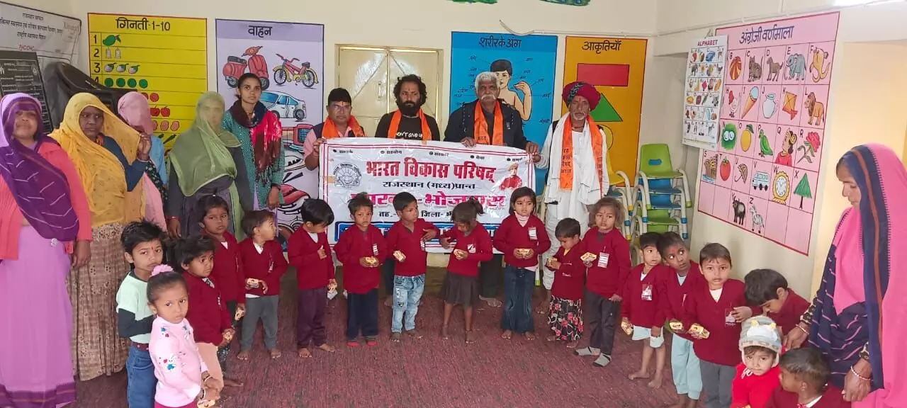 आकोला (रमेश चंद्र डाड)भारत विकास परिषद शाखा भोजरास द्वारा आज 65 जर्सियां जरूरतमंद बच्चों, बुजुर्ग सहित चार आंगनबाड़ी केंद्र(आंगनबाड़ी केंद्र भोजरास1, आंगनबाड़ी केंद्र लक्ष्मणपुरा, आंगनबाड़ी केंद्र आपलियास, आंगनबाड़ी केंद्र भगवानपुरा )के जरूरतमंद नन्हे मुन्ने बच्चों को तिलक लगाकर, बिस्कुट पैकेट देकर जर्सी वितरण की गई। आंगनबाड़ी केंद्रों पर बच्चों के चेहरे खुशी से झूम उठे। इस खुशी को परिषद के माध्यम से साकार करने वाले (रणजीत गोरा, सोलिन राय, भंवर लाल शर्मा, कन्हैया लाल गुर्जर) आदि भामाशाहों का सहयोग प्राप्त हुआ। भोजरास शाखा परिवार की ओर से उन सभी भामाशाहों का धन्यवाद ज्ञापित किया गया। इस सत्र में अभी तक शाखा द्वारा 191 जर्सीया वितरण की गई। इस अवसर पर शाखा अध्यक्ष भंवरलाल टेलर, शाखा सेवा प्रमुख अशोक अजमेरा, शाखा पूर्व अध्यक्ष लादूराम जाट, पूरणमल मानावत, आदि परिषद सदस्य, रघुनाथ चौहान, गोकुल गुर्जर, गजानंद शर्मा, घासी गुर्जर आदि ग्रामीण जन व परिषद मातृशक्ति रेखा देवी अजमेरा, कैलाश देवी टेलर, सुमित्रा जाट, ऋषि राज , विमला शर्मा व आंगनबाड़ी सहायिकाएं उपस्थिति रही। आंगनवाड़ी कार्यकर्ता द्वारा सभी परिषद सदस्यों का धन्यवाद ज्ञापित किया गया।