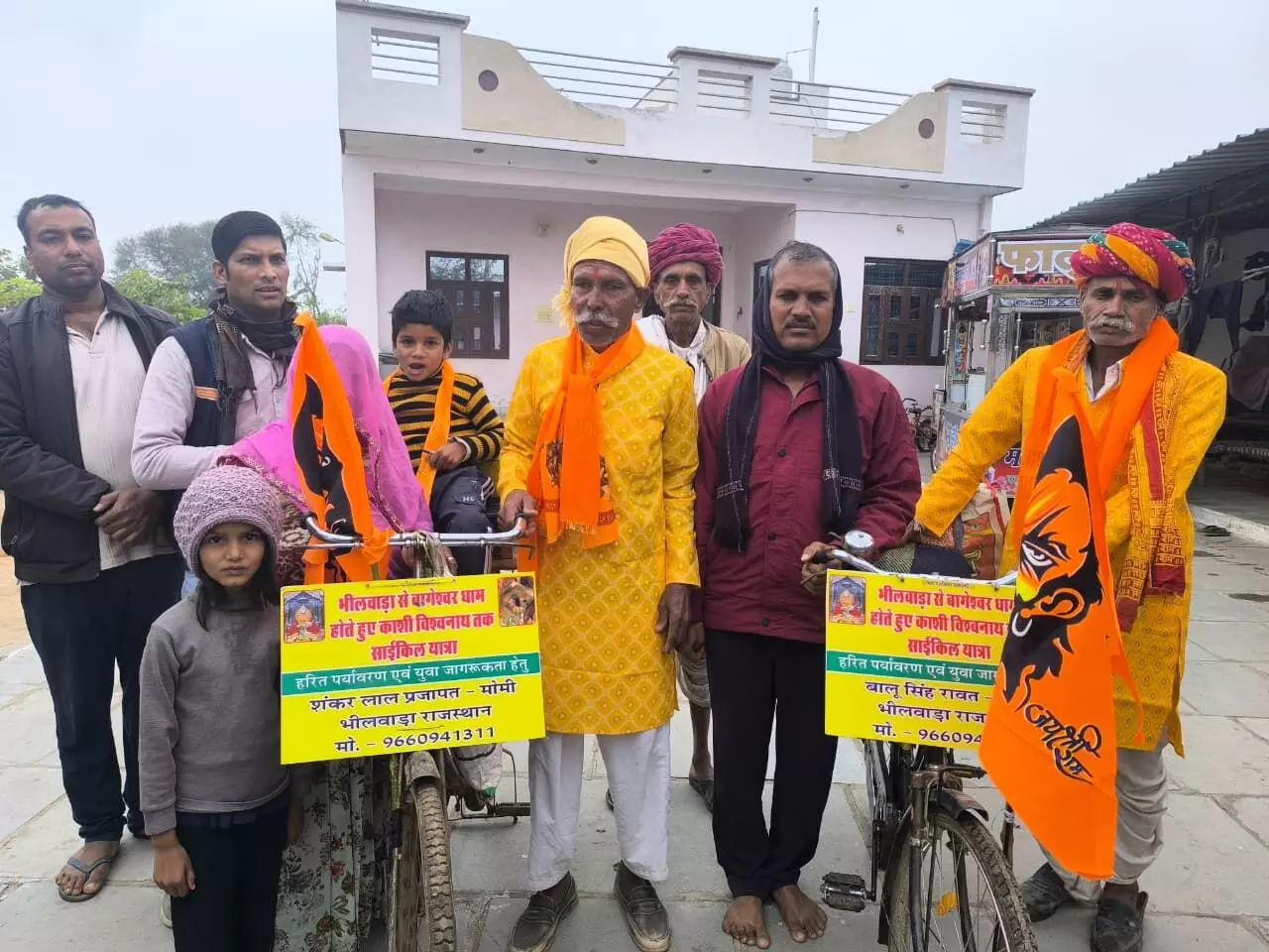 गुरला :-(बद्री लाल माली) नेशनल हाईवे 758 स्थित गुरला के मोमी से दो पर्यावरण प्रेमी मोमी के शंकर लाल प्रजापत एवं बालू सिंह रावत। दोनों पर्यावरण प्रेमी द्वारा मोमी से बागेश्वर धाम होते हुए काशी विश्वनाथ की साइकिल यात्रा आज से प्रारंभ। आज समस्त मोमी ग्रामवासी द्वार स्वागत कर द्वारा दोनों पर्यावरण प्रेमियों को सम्मान काशी विश्वनाथ साइकिल यात्रा के लिए । यह साइकिल यात्रा पर्यावरण सुरक्षा का संदेश वर्तमान युवाओं को प्रेरणा देने के लिए विश्व कल्याण के लिए की जा रही है। पहले शंकर लाल प्रजापत अयोध्या भगवान श्री राम मंदिर की साइकिल यात्रा से कुशल कर चुके हैं।
