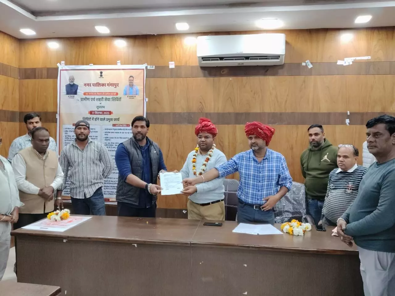 गंगापुर (दिनेश लक्षकार) |गंगापुर नगरपालिका में आज वर्तमान मंडल के 5 वर्ष पूर्ण होने पर सफाई कर्मचारी संघ द्वारा सम्मान समारोह आयोजित किया गया । जिसमें कर्मचारियों ने नगर पालिका अध्यक्ष दिनेश चंद्र तेली के पहले 5 वर्ष का कार्यकाल पूर्ण करने का कीर्तिमान स्थापित करने पर साफा बंधवाकर अभिनंदन किया। इस अवसर पर नगर पालिका अध्यक्ष दिनेश चंद्र तेली और अधिशासी अधिकारी करणी सिंह सौदा ने सफाई जमादार राहुल हरिजन की स्वास्थ्य निरीक्षक पद पर पदोन्नति को लेकर प्रमाण पत्र भी दिया । इसी के साथ अनुकंपा नियुक्ति को लेकर रंजना हरिजन को भी प्रमाण पत्र प्रदान किया गया। इस अवसर पर पार्षद हरीश श्रोत्रिय के साथ पालिका के सफाई कर्मचारी व अन्य कर्मचारी गण उपस्थित थे।