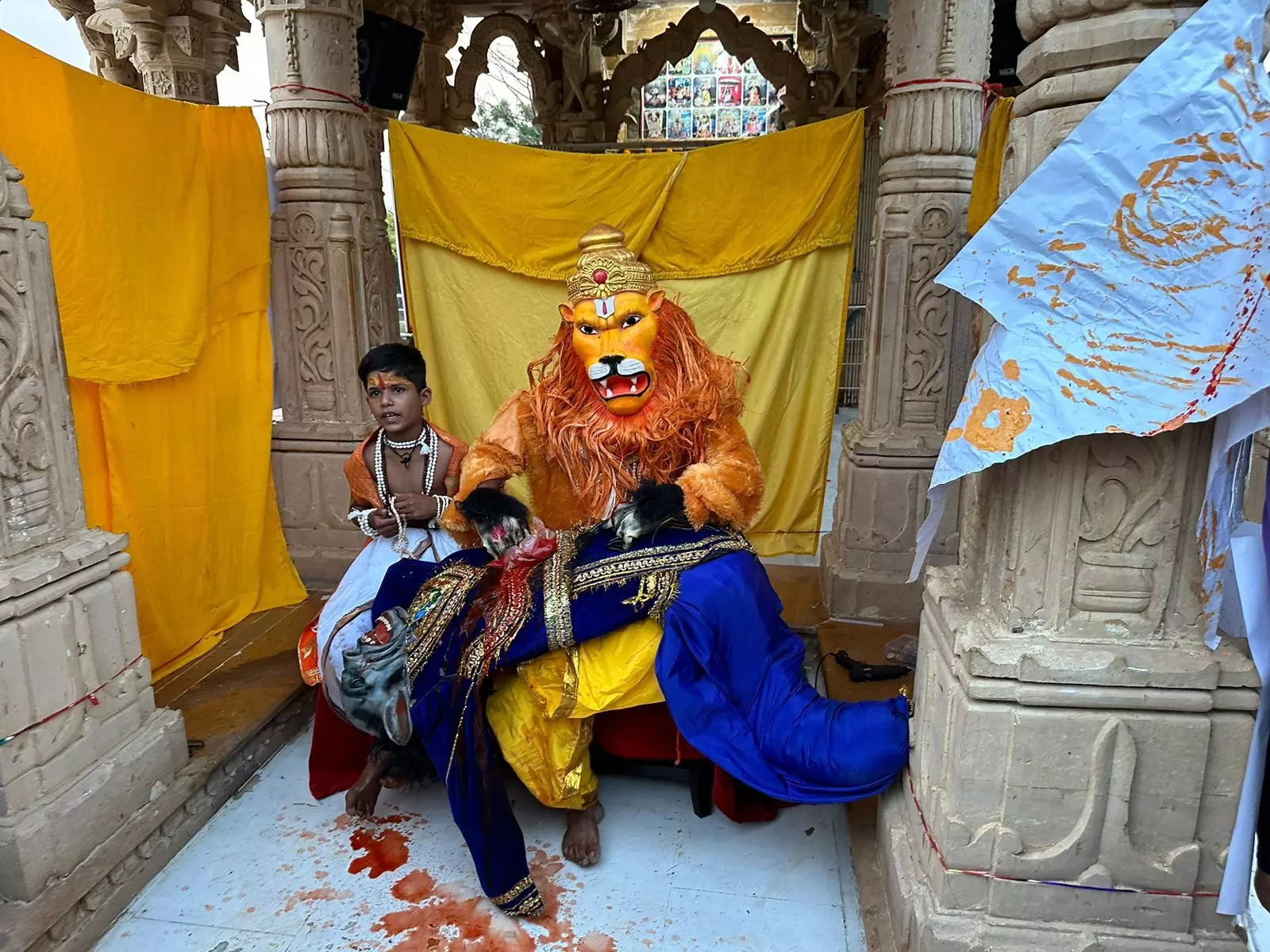 भीलवाड़ा। माधव गौ विज्ञान अनुसंधान संस्थान की ओर से नौगांवा में संचालित माधव गौशाला परिसर के सांवरिया सेठ मंदिर में बैसाख शुक्ल चतुर्दशी मंगलवार को नृसिंह जयंती धूमधाम से मनाई गई। मंदिर व्यवस्था प्रबंधन प्रमुख गोविंद प्रसाद सोडानी ने बताया आकर्षक श्रृंगार के बाद सुबह नीले वस्त्रों में हिरण्यकश्यप को जीप में शहर के बापूनगर, शास्त्रीनगर, आजाद नगर, महावीरनगर, सदर बाजार, गोल प्याऊ चौराहा आदि क्षेत्रों में घुमाया गया। हिरण्यकश्यप शहर वासियों के आकर्षण का केंद्र रहा। हिरण्यकश्यप को देख बच्चे भी भयभीत हुए। गौशाला में नृसिंह अवतार के भव्य खम्ब बनाया गया। शाम 6.30 बजे खम्ब फाड़ कर भगवान नृसिंह ने अवतार लिया और हिरण्यकश्यप का वध कर भक्त प्रहलाद को बचाया। यह दृश्य सभी के आकर्षण का केंद्र रहा। हिरण्यकश्यप के वध के बाद आरती की गई। सुबह मंदिर में भगवान का दूध से अभिषेक किया गया। हिरण्यकश्यप का अभिनय पुर के गोभक्त मोनू माली ने किया। नृसिंह का किरदार पुर के बंटी पाराशर ने निभाया। भक्त प्रहलाद का अभिनय प्रिंस ने निभाया। इस मौके पर संस्थान के सचिव सत्यप्रकाश गगड़, सुरेश भाई, मदन धाकड़, बाबूलाल आदि का सहयोग रहा।