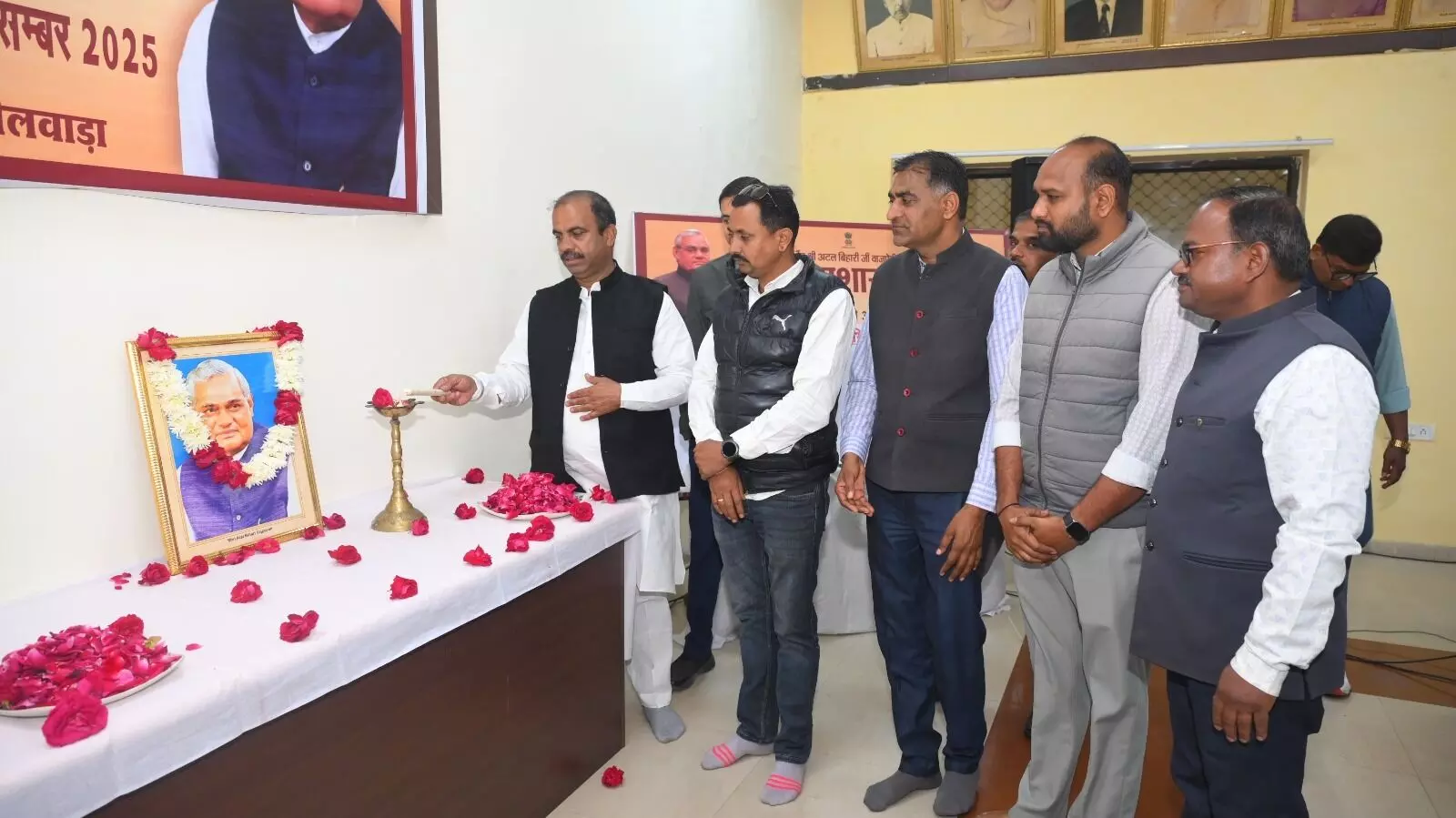 भीलवाड़ा | भारत रत्न पूर्व प्रधानमंत्री स्वर्गीय अटल बिहारी वाजपेई के जन्म शताब्दी के उपलक्ष में दिनांक 25 दिसंबर 2025 से 31 दिसंबर 2025 तक राज्य सुशासन सप्ताह का आयोजन किया जा रहा है उक्त सप्ताह के तहत दिनांक 25 दिसंबर 2025 को प्रातः 10:00 बजे नगर निगम मीटिंग हॉल में स्वर्गीय अटल बिहारी वाजपेई के छायाचित्र पर माल्यार्पण, दीप्रज्जवलन एवं कविता पाठ का कार्यक्रम आयोजित किया गया कार्यक्रम में महापौर राकेश पाठक द्वारा उपस्थित जनप्रतिनिधियों,अधिकारियो एवं कर्मचारियों को सुशासन संकल्प दिलाया गया एवं वाजपेई के सिद्धांतों पर चलने का आह्वान किया इस अवसर पर पार्षद सूरज बिश्नोई ,गजेंद्र सिंह,अधिशासी अभियंता पवन नुवाल, पुष्पेंद्र बैरागी सुरेश चंद्र कास्ट,शिवकुमार गारू सहित जनप्रतिनिधि एवं निगम के अधिकारी कर्मचारी उपस्थित रहे।