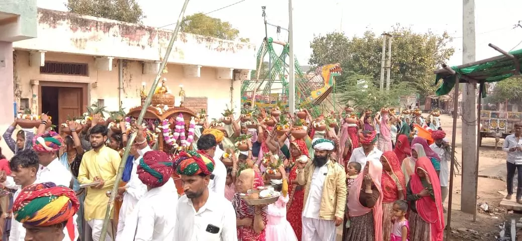आकोला (रमेश चंद्र डाड) क्षेत्र के गेणोली गांव में देवनारायण भगवान मंदिर मे सप्तमी बंधेज पूर्णाहुति के उपलक्ष में चारभुजा का बैवाण नगर भ्रमण निकाला देवनारायण भगवान की शोभायात्रा शुरू जो मुख्य बाजार होती हुई मंदिर पहुंची बंधेज सदस्यो एवं महिला पुरूषो ने डीजे की धुन पर जयकारे लगाते हुए नाचते गाते मंदिर मंदिर पहुंचकर श्री चारभुजा एवं देवनारायण भगवान की पूजा अर्चना की