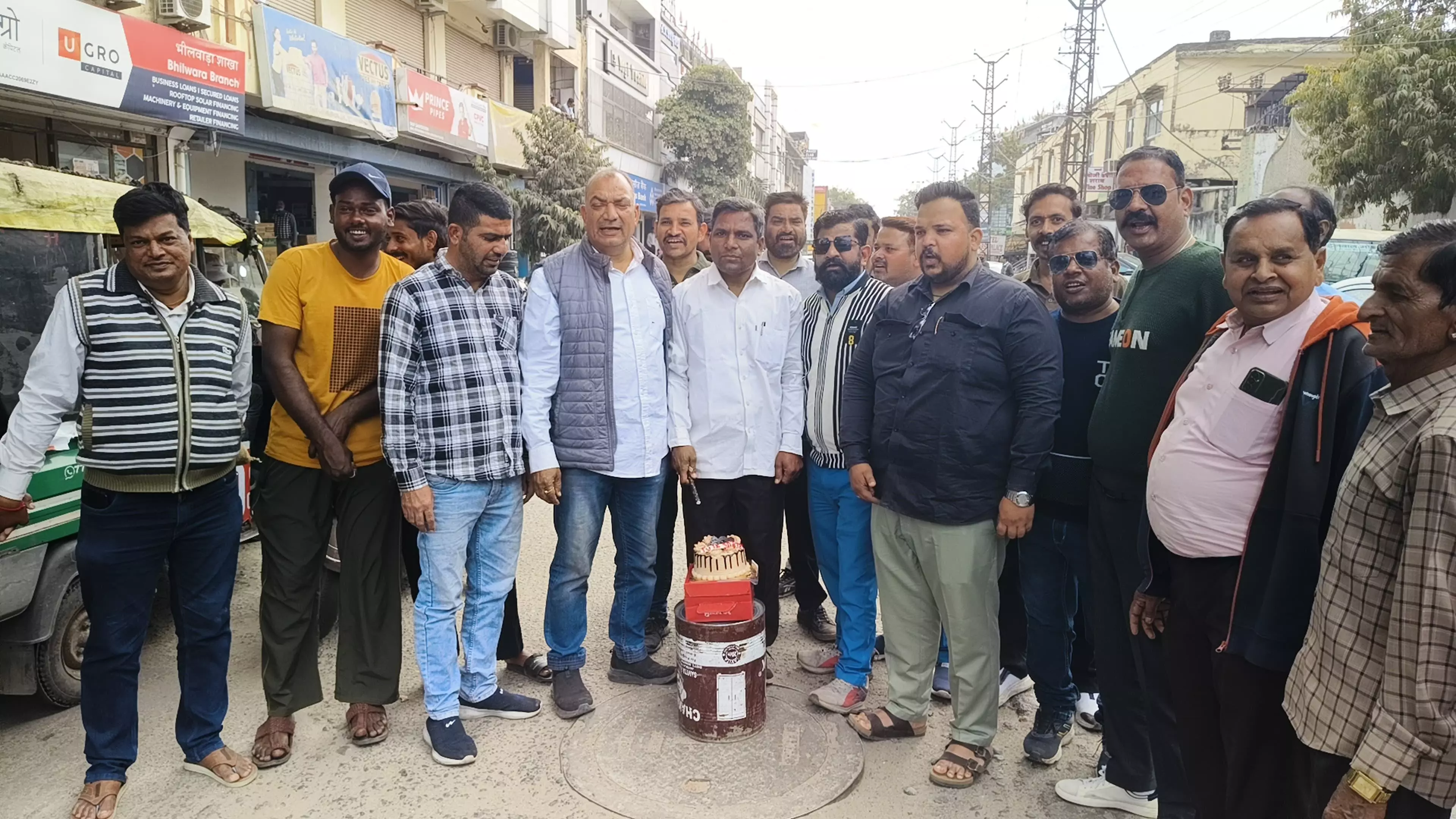 भीलवाड़ा |आज दोपहर 1:30 नेता प्रतिपक्ष नगर निगम धर्मेंद्र पारीक के नेतृत्व व प्रदेश कांग्रेस कमेटी सदस्य मनोज पालीवाल के सानिध्य में स्थानीय नागरिकों दुकान मालिकों ने मिलकर के होटल हर्ष पैलेस से टूटी सड़क का केक हाथ में लेकर के टूटी सड़क सही करो हमारी मांगे पूरी करो हैप्पी बर्थडे टूटी सड़क के नारे लगाते हुए अगले चौराहे तक पहुंचने के बाद सीवरेज के चेंबर के ऊपर केक काटा और प्रशासन हाय हाय जन प्रतिनिधि हाय हाय के नारे लगाए