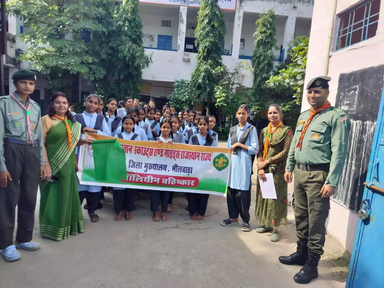 भीलवाड़ा | हिंदुस्तान स्काउट एंड गाइड जिला मुख्यालय भीलवाड़ा के तत्वाधान में राजकीय बालिका उच्च माध्यमिक विद्यालय पांसल में चल रहे कोमल पद व रजत किरण शिविर के दौरान बालिकाओं को स्काउट गाइड का प्रशिक्षण दिया गया शिविर के दौरान जन चेतना रैली का आयोजन किया गया जिसमें आमजन को जागरूक होने के लिए प्रेरित किया गया। जिला ऑर्गेनाइजर मोहनलाल महरिया ने बताया कि रैली का आयोजन संस्था प्रधान लता सारस्वत ने हरी झंडी दिखाकर किया साथ ही स्काउट प्रभारी गायत्री प्रजापत आरती गोस्वामी और समस्त विद्यालय स्टाफ उपस्थित रहा और शिविर के दौरान वृक्षारोपण कार्यक्रम का आयोजन भी किया गया