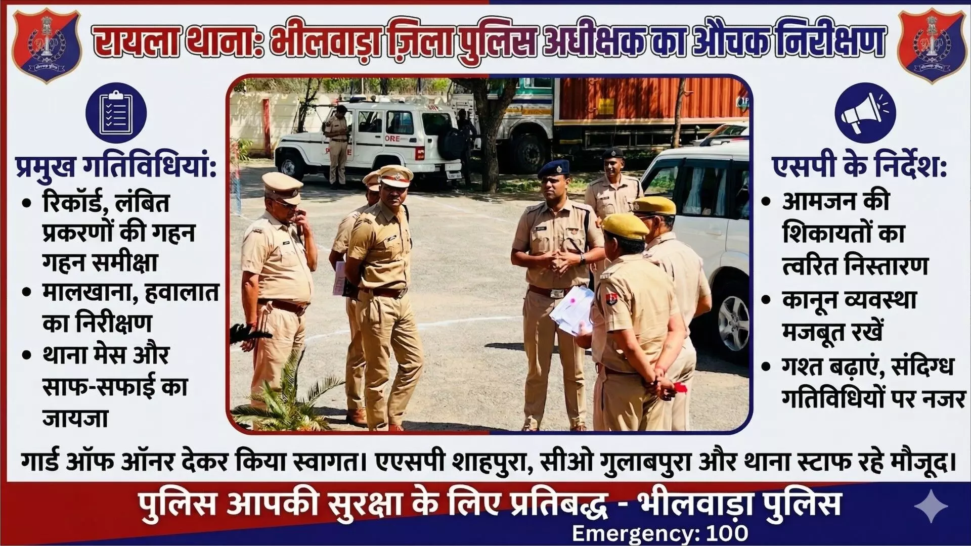 एसपी ने कानून व्यवस्था को और अधिक सुदृढ़ बनाने के लिए नियमित गश्त बढ़ाने और क्षेत्र की संदिग्ध गतिविधियों पर पैनी नजर रखने के निर्देश दिए। उन्होंने पुलिसकर्मियों को अनुशासन और जिम्मेदारी के साथ कार्य करने के लिए प्रेरित करते हुए लंबित मामलों को जल्द से जल्द निपटाने पर जोर दिया। इस अवसर पर अतिरिक्त पुलिस अधीक्षक (शाहपुरा) राजेश आर्य, वृत्ताधिकारी (गुलाबपुरा) जितेंद्र सिंह सहित थाना स्टाफ उपस्थित रहा।