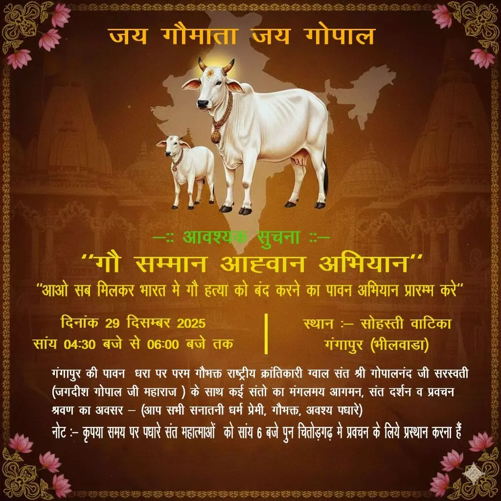 गोमाता के सम्मान और गो हत्या पर पूर्ण प्रतिबंध की मांग को लेकर गंगापुर में 29 दिसंबर सोमवार को “गो सम्मान आह्वान अभियान” का आयोजन किया जाएगा। यह अभियान सोहस्ती वाटिका, गंगापुर में सोमवार को सायं 4:30 बजे से 6:00 बजे तक आयोजित होगा। आयोजन का उद्देश्य भारत में गो हत्या पर रोक के लिये केंद्र सरकार से शांतिपूर्ण तरीके से कानून बनाने की मांग को लेकर सम्पूर्ण भारत मे जन जागरण फैलाना एवं समाज को एकजुट करना है।