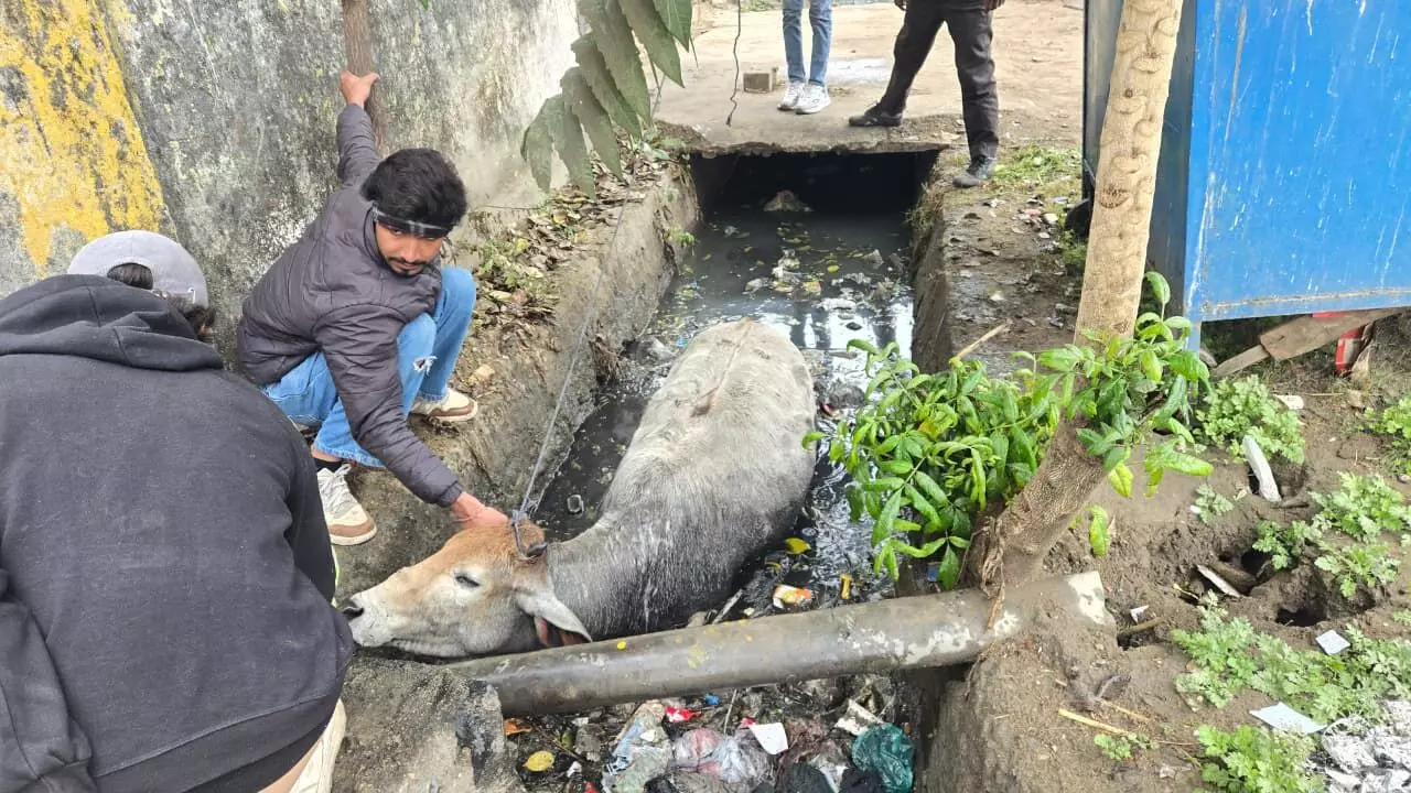 नाले में गिरी गौमाता को सुरक्षित निकाला
