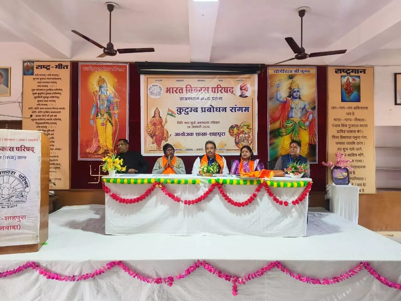 भीलवाड़ा । भारत विकास परिषद, राजस्थान मध्य प्रांत द्वारा शाहपुरा शाखा अध्यक्ष पवन बांगड़ की देखरेख में आदर्श विद्या मंदिर, शाहपुरा में आयोजित परिवारों का महाकुंभ 'कुटुंब प्रबोधन संगम-2026' रविवार को हर्षोल्लास के साथ संपन्न हुआ। इस समागम में सैंकड़ों परिवारों नेआधुनिकता के बीच अपनी जड़ों से जुड़े रहने का संकल्प लिया। कार्यक्रम के मुख्य वक्ता, कुटुंब प्रबोधन संयोजक (चित्तौड़ प्रांत) सूर्यप्रकाश शर्मा ने अपने उद्बोधन में 'स्व' (स्वभाषा, स्वभूषा, स्वभोजन) पर बल दिया। उन्होंने कहा, "यदि हम अपनी मातृभाषा, भारतीय वेशभूषा और पारंपरिक भोजन को त्याग देंगे, तो संस्कार स्वतः ही लुप्त हो जाएंगे। परिवार की मजबूती के लिए दिन में कम से कम एक बार सभी सदस्य साथ बैठकर भोजन करें और अपनी संस्कृति के प्रति गर्व व्यक्त करने के लिए हिंदी में हस्ताक्षर करने की आदत डालें।" द्वितीय सत्र में बिड़ला ग्रुप के उपाध्यक्ष बलराज आचार्य ने कहा कि संयुक्त परिवार ही वह पाठशाला है जहाँ बच्चों में धैर्य और सेवा के भाव विकसित होते हैं। कार्यक्रम की अध्यक्षता प्रांतीय अध्यक्ष राधेश्याम सोमानी ने की। दोपहर में आयोजित पारंपरिक खेलों ने डिजिटल युग के दौर में विस्मृत हो रहे बचपन को जीवंत कर दिया। आयोजन में शाहपुरा शाखा अध्यक्ष पवन कुमार बांगड़, सचिव सत्यनारायण सैन, प्रांतीय संयोजक प्रवीण जैन एवं द्वारका प्रसाद जोशी ने आगंतुकों का आभार व्यक्त किया। इस अवसर पर महासचिव आनंद सिंह राठौड़ और वित्त सचिव अमित सोनी सहित कई पदाधिकारी उपस्थित रहे।