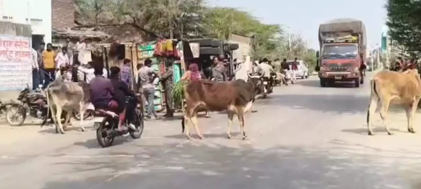 जहाजपुर के कुराड़िया गांव में गाय को बचाने के प्रयास में टमाटरों से भरा ट्रक पलटा, बड़ा हादसा टला