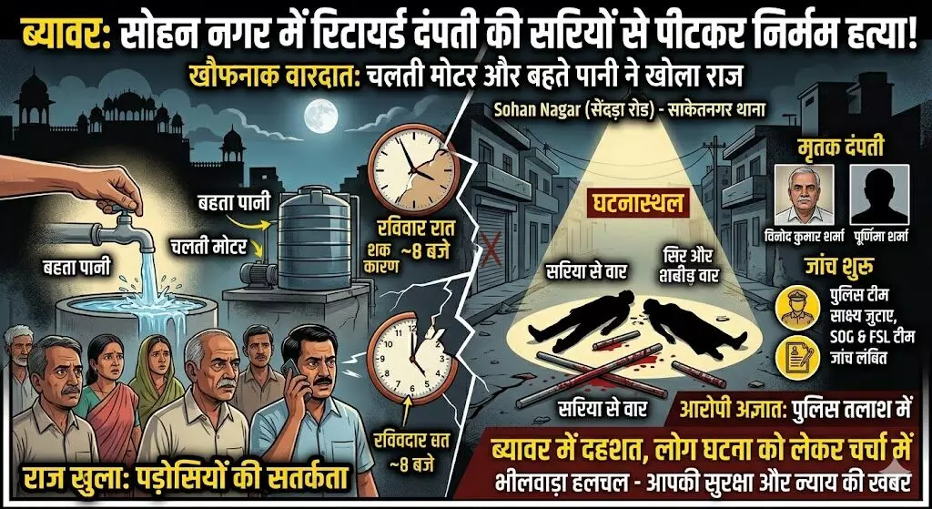 ब्यावर। जिला मुख्यालय के साकेतनगर थाना क्षेत्र स्थित सेंदड़ा रोड, सोहन नगर में रविवार शाम दोहरे हत्याकांड से पूरे इलाके में सनसनी फैल गई। घर में अकेले रह रहे सेवानिवृत्त (रिटायर्ड) दंपती की अज्ञात हमलावरों ने लोहे के सरियों से वार कर बेरहमी से हत्या कर दी। इस रूहानी वारदात का खुलासा तब हुआ जब घर के बाहर लगातार बहते पानी और चलती मोटर ने पड़ोसियों का ध्यान खींचा।