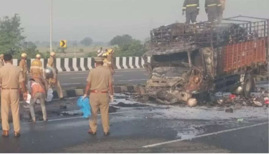 हाईवे पर कार और कैंटर में भिड़ंत, आग लगने से पांच लोगों की मौत