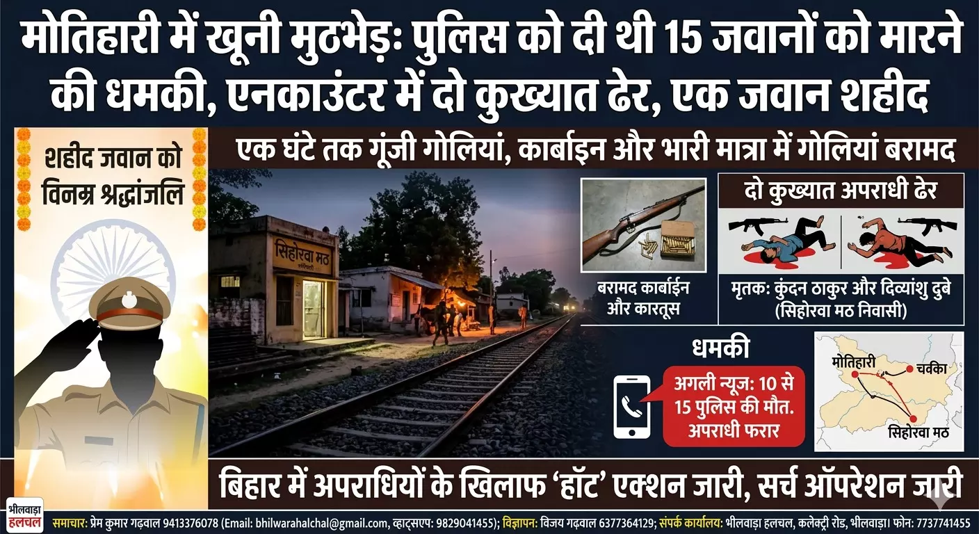 मोतिहारी/बिहार। बिहार के मोतिहारी में सोमवार की देर रात पुलिस और अपराधियों के बीच हुआ आमना-सामना खून-खराबे में बदल गया। चकिया थाना क्षेत्र के सिहोरवा मठ के पास हुई इस भीषण मुठभेड़ में दो कुख्यात अपराधियों को पुलिस ने ढेर कर दिया, हालांकि इस कार्रवाई में पुलिस विभाग का एक जांबाज जवान भी शहीद हो गया। करीब एक घंटे तक चले इस 'गैंगवार' जैसे मंजर ने पूरे इलाके को दहला दिया है।