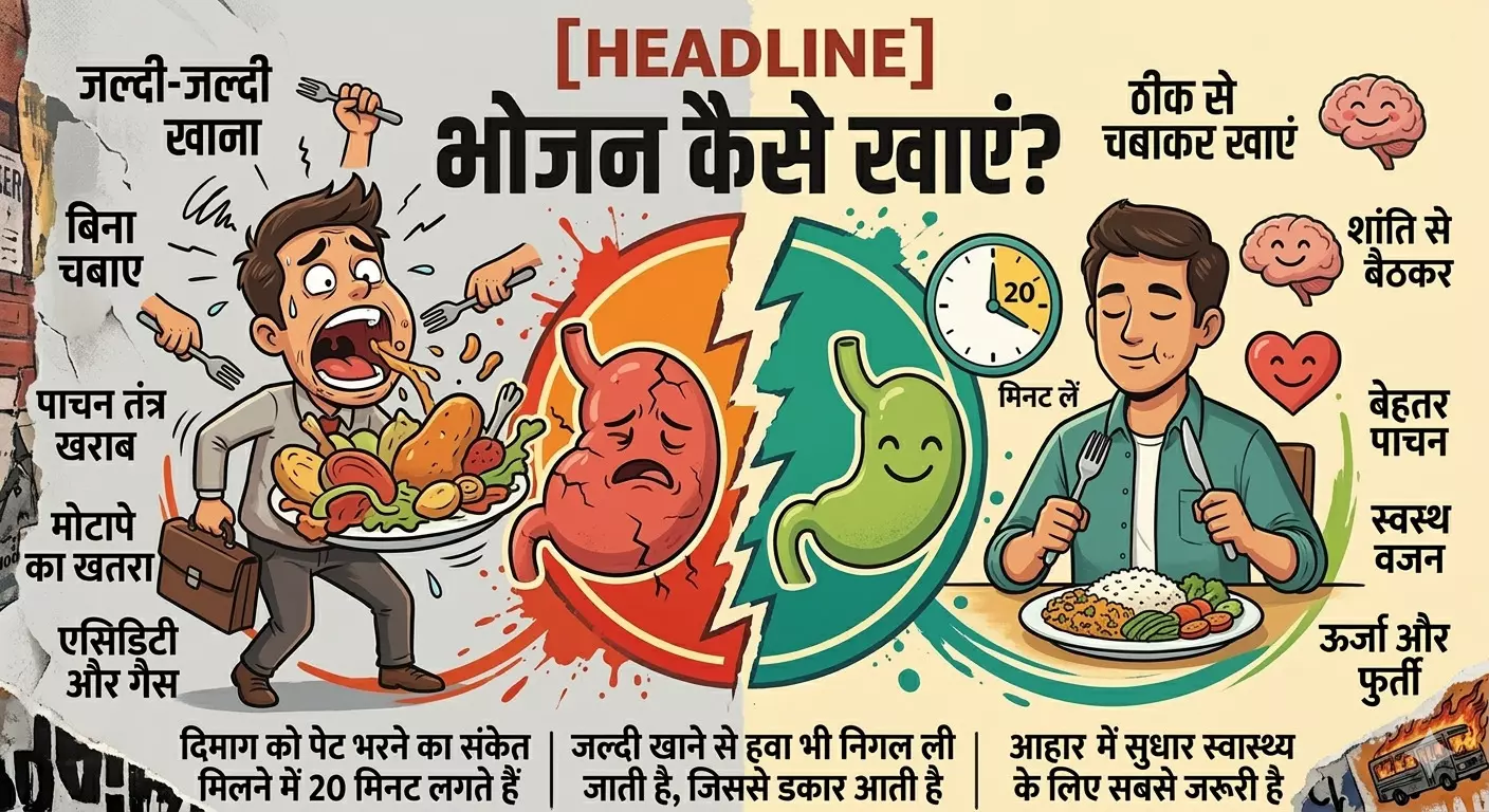 आज की भागदौड़ भरी जिंदगी और ऑफिस की जल्दी में लोगों की खान-पान की आदतें तेजी से बदल रही हैं। वक्त की कमी के चलते अधिकतर लोग सुकून से बैठकर खाना खाने के बजाय जल्दी-जल्दी भोजन निगलने लगे हैं। स्वास्थ्य विशेषज्ञों ने चेतावनी दी है कि यह आदत सेहत के लिए किसी खतरे की घंटी से कम नहीं है।