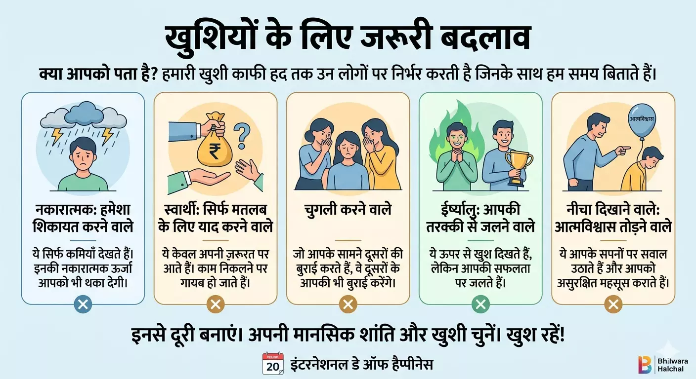 मनोवैज्ञानिकों और जीवन विशेषज्ञों का मानना है कि हमारी खुशी काफी हद तक उन लोगों पर निर्भर करती है, जिनके साथ हम अपना ज्यादातर समय बिताते हैं। हमारे आस-पास कुछ ऐसे 'टॉक्सिक' (विषैले) व्यक्तित्व वाले लोग होते हैं, जो दीमक की तरह हमारी मानसिक शांति को धीरे-धीरे खत्म कर देते हैं। 'इंटरनेशनल डे ऑफ हैप्पीनेस' के अवसर पर भीलवाड़ा हलचल आपको बता रहा है कि किन 5 तरह के लोगों से दूरी बनाकर आप अपनी जिंदगी को खुशहाल बना सकते हैं।