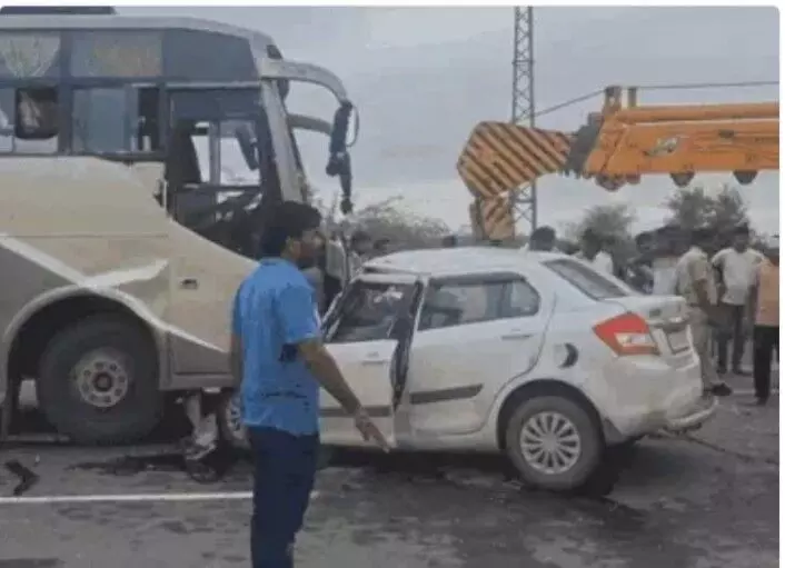 बस-दो कारों की भिड़ंत, परिवार के 4 लोगों की मौत:3 साल की दोहिती और नानी गंभीर घायल, ओवरटेक करने के चक्कर में मेगा हाईवे पर हादसा