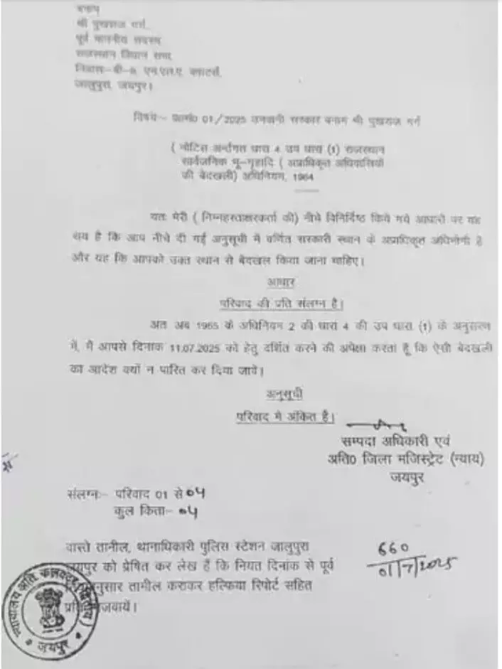 नागौर सांसद सांसद हनुमान बेनीवाल को सरकारी आवास खाली करने के लिए संपदा अधिकारी एंव अतिरिक्त जिला मजिस्ट्रेट (न्यायिक) ने गुरुवार को उन्हें बेदखली नोटिस जारी किया है।