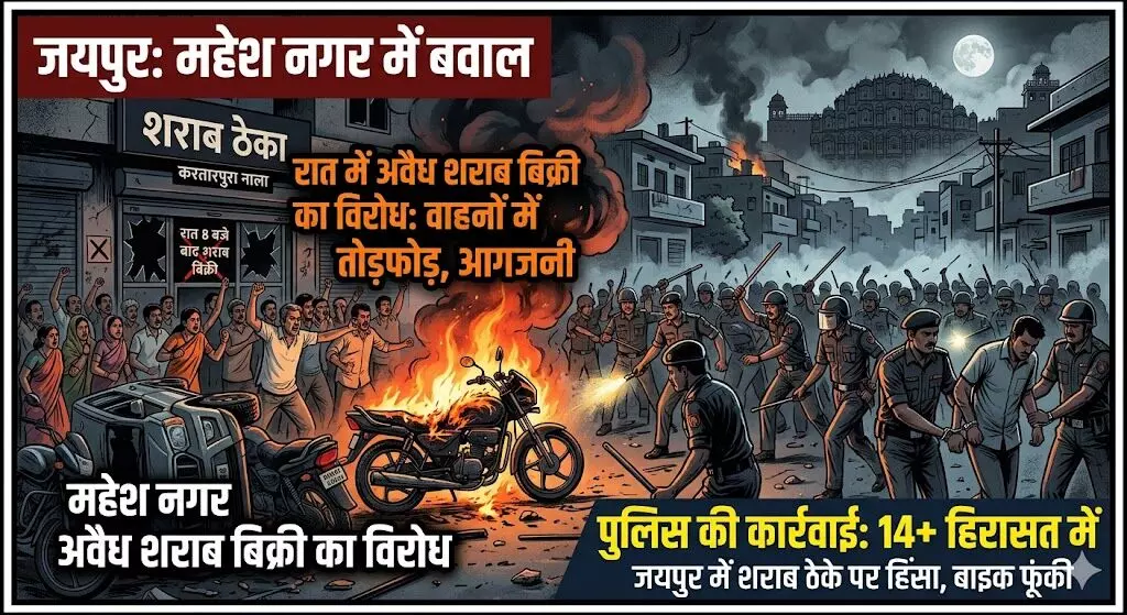 जयपुर: महेश नगर में शराब ठेके पर बवाल, पुलिस के सामने फूंकी बाइक; 14 हिरासत में