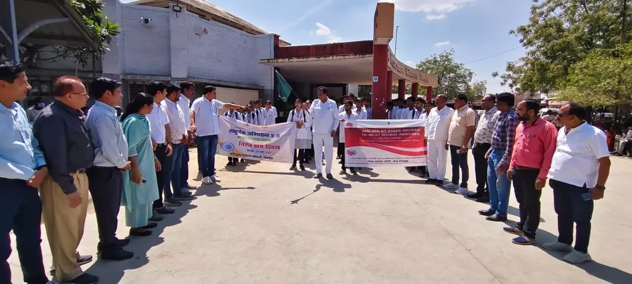 निम्बाहेड़ा। विश्व टीबी दिवस के अवसर पर जिला चिकित्सालय निम्बाहेड़ा में टीबी मुक्त भारत अभियान - 2 के अंतर्गत 100 दिवसीय अभियान के दौरान मंगलवार को पूर्व यूडीएच मंत्री एवं विधायक चंद कृपलानी के मुख्य आतिथ्य में विशेष कार्यक्रम का आयोजन किया गया। कार्यक्रम के तहत नर्सिंग कॉलेज निम्बाहेड़ा के छात्र छात्राओं द्वारा टीबी उन्मूलन जागरूकता रैली निकाली गई, जिसे विधायक कृपलानी ने हरि झंडी दिखा कर रवाना किया।