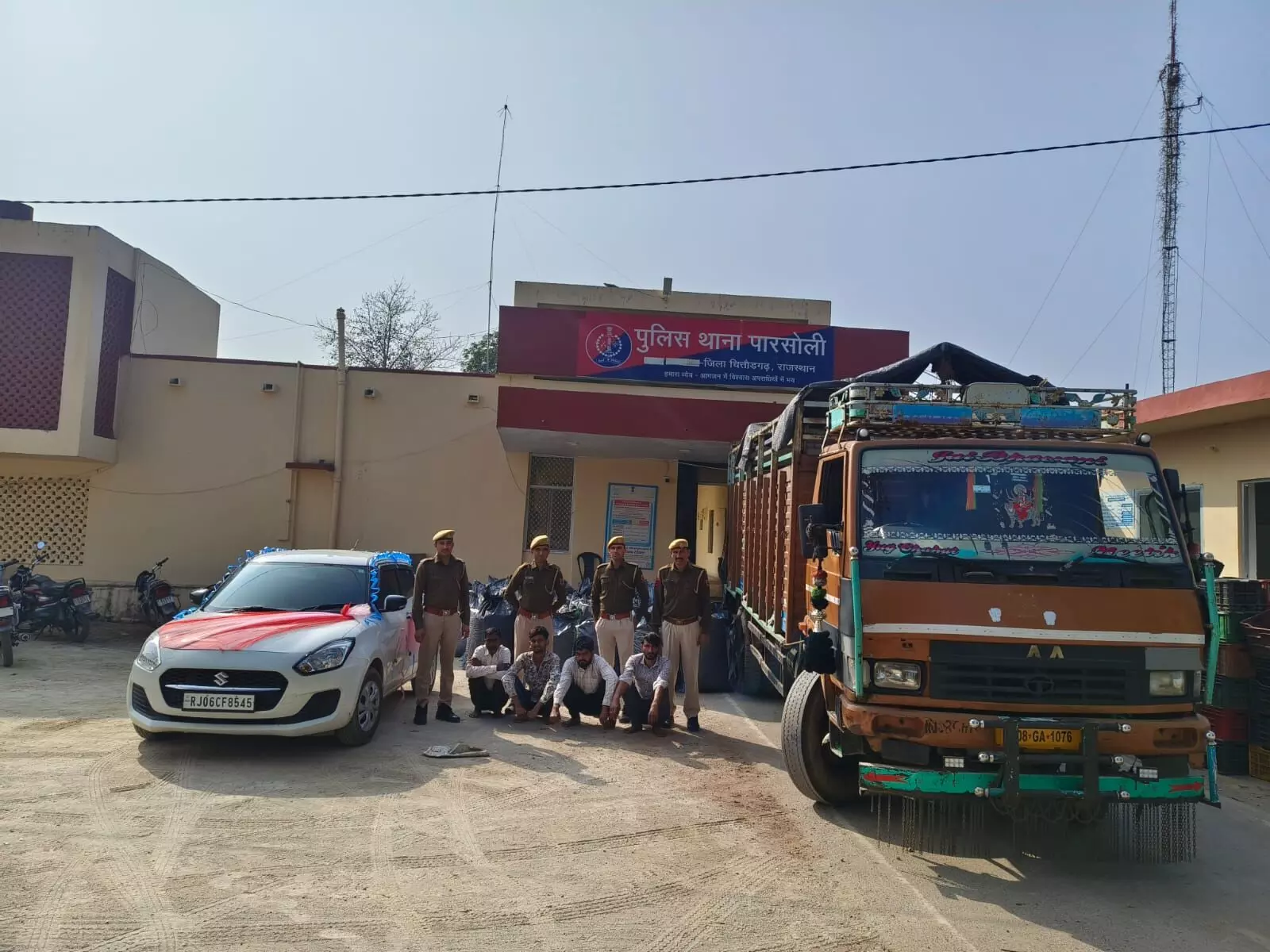 पुलिस अधीक्षक सुधीर जोशी ने बताया कि पुलिस मुख्यालय जयपुर, राजस्थान द्वारा मादक पदार्थों के विरुद्ध कार्यवाही हेतु चलाये जा रहे विशेष अभियान के अन्तर्गत एएसपी रावतभाटा भगवत सिंह व डीएसपी बेगूं अंजलि सिंह के निर्देशन में थानाधिकारी पारसोली प्रेमसिंह के नेतृत्व में कानि मनोज, प्रीतम, शीशराम, जितेन्द्र, रतनसिंह व हरिकृष्ण द्वारा मादक पदार्थों की धरपकड हेतु गश्त की जा रही थी। गश्त के दौरान सूचना के आधार पर हाईवे रोड पारसोली बस स्टेण्ड पर नाकाबंदी की जाकर आकस्मिक चेकिंग की जा रही थी। नाकाबंदी के दौरान चितौडगढ की तरफ से एक मारुति सुजुकी स्विफ्ट कार आई, जिसमें सवार दो युवको को रुकवाकर नाम पता पूछते हुए रात्री के समय घूमने का कारण पूछा गया तो दोनो पुलिस को देखकर घबरा गए। युवको ने अपना नाम पारसोली थाने के तोरणिया निवासी सांवरिया लाल पुत्र कन्हैयालाल गुर्जर व पारसोली थाने के उमरथूना निवासी गौरीलाल उर्फ गौरुलाल पुत्र भैरुलाल गुर्जर बताया। रात्री के समय घूमने के संबंध में कोई जवाब नहीं दे सके। कार में सवार युवको से कडाई से पूछताछ करने पर राजगढ़ की तरफ से अफीम डोडाचूरा से भरा हुआ ट्रक आना एवं ट्रक के आगे आगे चलकर पायलेटिंग करना बताया। दोनो युवको से पूछताछ के दौरान चितौडगढ से एक ट्रक आया जिसके पीछे की बॉडी पर काला तिरपाल बांधा हुआ था। ट्रक को रुकवाकर तलाशी ली गई तो ट्रक के केबिन में दो व्यक्ति मिले।जिनके नाम पते पूछने पर दोनो ने अपना नाम बेगूं थाने के झाला मस्जिद के पास सलावटो का मोहल्ला बेगूं निवासी वसीम खां उर्फ पाले खां पुत्र मोहम्मद रफीक व रिजवान हुसैन पुत्र जमील खां पठान होना बताया।