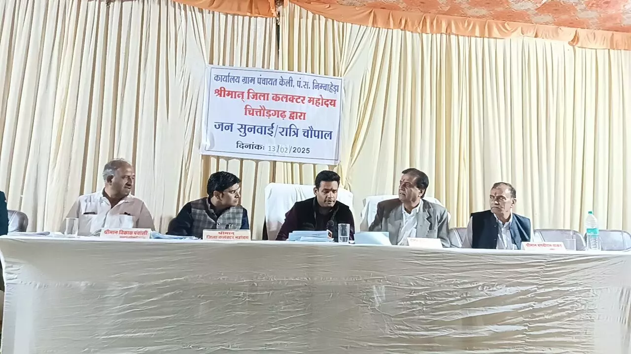 चित्तौड़गढ़ । जिले के निम्बाहेड़ा पंचायत समिति के केली ग्राम पंचायत के विद्यालय प्रांगण में पूर्व मंत्री एवं निम्बाहेड़ा विधायक श्रीचन्द कृपलानी एवं जिला कलक्टर आलोक रंजन की मौजूदगी में गुरुवार 13 फरवरी को रात्रि चौपाल का आयोजन किया गया। इस अवसर पर ग्रामीणों को अपने समस्याओं के समाधान का मौका मिला। चौपाल में 40 से अधिक परिवाद प्राप्त हुए। चौपाल के दौरान अतिक्रमण हटाने, मोक्षधाम के लिए भूमि दिलवाने, पट्टा दिलवाने, विद्यालय के खेल मैदान से 11 हजार केवी विद्युत लाइन हटाने, मंदिर हेतु भूमि दिलवाने, राशन की दुकान को समय पर खुलवाने और पेंशन से संबंधित 40 से अधिक परिवाद प्राप्त हुए। इन परिवादों का मौके पर ही निस्तारण किया गया और जिन मामलों में तुरंत समाधान संभव नहीं था, उनके लिए त्वरित कार्यवाही करते हुए जल्द निस्तारण के निर्देश दिए गए। रात्रि चौपाल में पूर्व विधायक अशोक नवलखा, प्रधान बगदीराम धाकड़, उपखंड अधिकारी विकास पंचोली, तहसीलदार, विकास अधिकारी, सरपंच, जनप्रतिनिधि सहित बड़ी संख्या में ग्रामीणजन उपस्थित रहे।