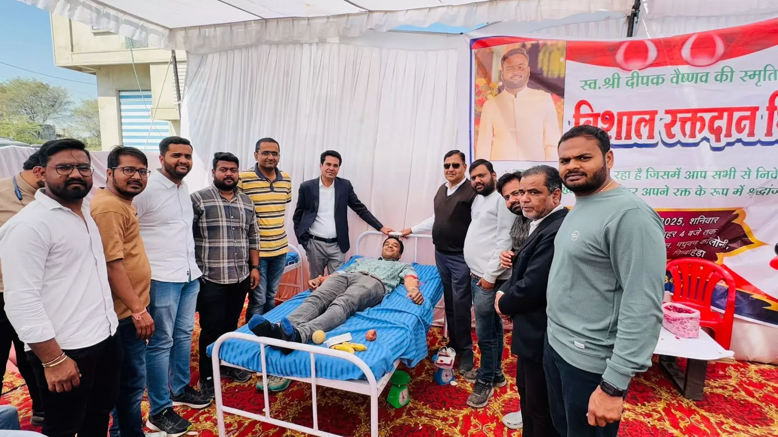 निंबाहेड़ा नगर पालिका के निवर्तमान अध्यक्ष सुभाष चंद्र शारदा, चित्तौड़गढ़ जिला फुटबॉल संघ के अध्यक्ष पूरण आंजना एवं छोटी सादड़ी पंचायत समिति के उप प्रधान विक्रम आंजना, विधानसभा क्षेत्र युवा कांग्रेस के पूर्व अध्यक्ष एवं निवर्तमान पार्षद रविप्रकाश सोनी एवं किराना व्यापार संघ एवं अग्रवाल समाज के नगर अध्यक्ष आशीष अग्रवाल ने विशाल रक्तदान शिविर में पहुंचकर रक्तदाताओं का हौसला बढ़ाया। प्रारंभ में अतिथियों ने स्वर्गीय श्री दीपक वैष्णव की तस्वीर पर माल्यार्पण एवं पुष्प अर्पित कर विशाल रक्तदान शिविर आरंभ करवाया। रक्तदान शिविर में अपने साथी स्वर्गीय दीपक वैष्णव को श्रद्धांजलि अर्पित करते हुए युवा साथियों ने बढ़चढकर हिस्सा लेते हुए रक्तदान किया। शिविर में कुल 204 यूनिट रक्तदान हुआ।