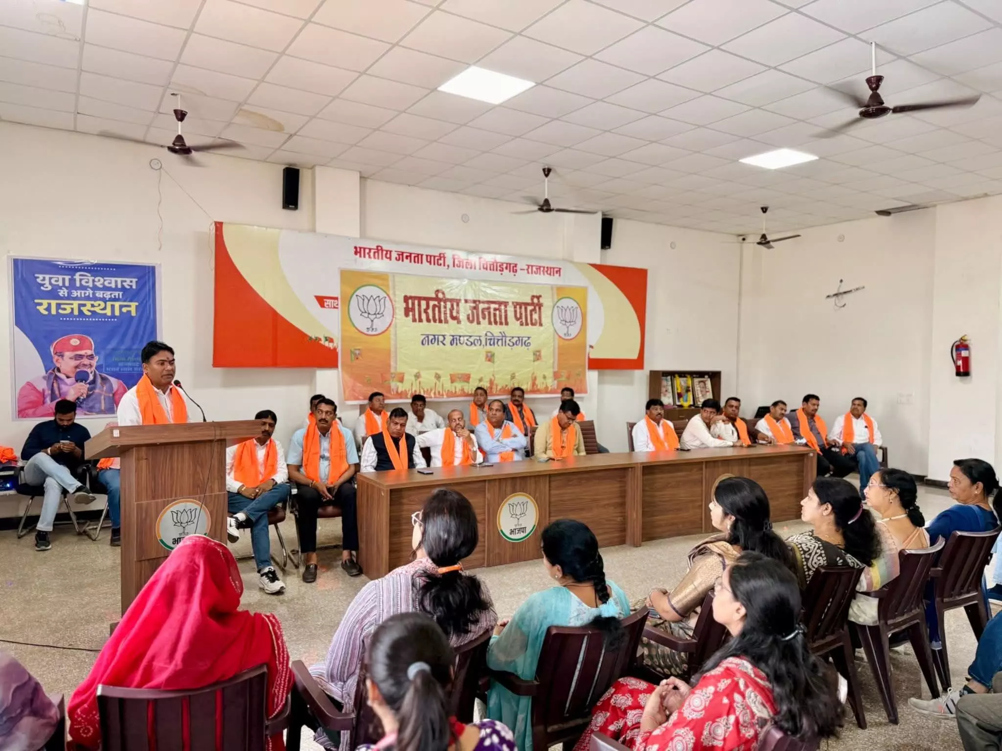 चितौड़गढ़ । भारतीय जनता पार्टी नगर मंडल चित्तौड़गढ़ की संगठनात्मक बैठक मंगलवार को ओछड़ी स्थित जिला भाजपा कार्यालय पर आयोजित हुई। बैठक के मुख्य अतिथि विधायक चंद्रमान सिंह आक्या रहे, अध्यक्षता नगर अध्यक्ष गौरव त्यागी ने की। भाजपा जिला मीडिया प्रभारी मनोज पारीक ने बताया कि विधायक चन्द्रभान सिंह आक्या ने कहा कि डबल इंजन की सरकार ने विकास को जन आंदोलन बना दिया है। केंद्र की मोदी सरकार व राज्य की भजनलाल शर्मा की डबल इंजन सरकार मे चित्तौड़गढ़ विधानसभा क्षेत्र में अभूतपूर्व विकास कार्य हुए हैं। उन्होंने कहा कि सड़क, बिजली, पानी, शिक्षा, स्वास्थ्य और आधारभूत ढांचे के क्षेत्र में जो कार्य हुए हैं, वे जनता के विश्वास को और मजबूत करते हैं। बजट में चित्तौड़गढ़ को मिली विकास कार्यों की सौगातों पर विचार व्यक्त करते हुये विधायक आक्या ने मुख्यमंत्री भजनलाल शर्मा के नेतृत्व में विधानसभा क्षेत्र में होने वाले आगामी विकास कार्यों को गति देने और उन्हें समयबद्ध पूर्ण कराने की बात कही ।