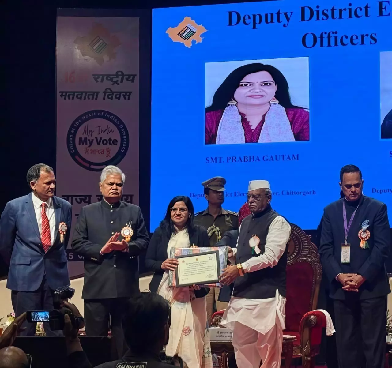 चित्तौड़गढ़, । 16वें राष्ट्रीय मतदाता दिवस 2026 के अवसर पर आयोजित राज्य स्तरीय समारोह में वर्ष 2025 में मतदाता सूचियों के विशेष गहन पुनरीक्षण–2026 से संबंधित कार्यों में उत्कृष्ट योगदान के लिए प्रभा गौतम, आरएएस, उप जिला निर्वाचन अधिकारी, चित्तौड़गढ़ को सम्मानित किया गया।